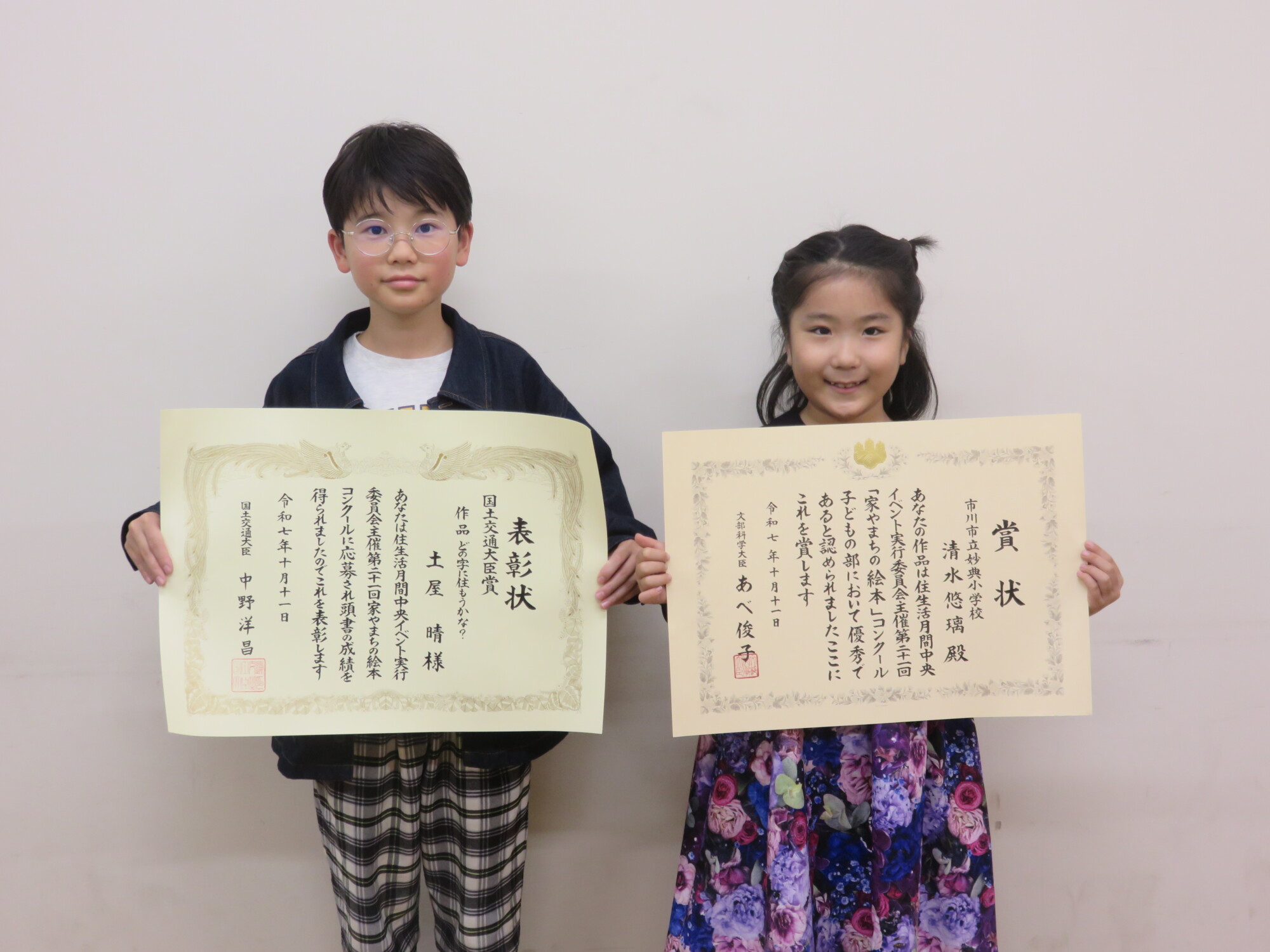 第21回「家やまちの絵本コンクール」(主催/住生活月間中央イベント実行委員会)において、妙典小学校の土屋晴さん(5年)が国土交通大臣賞を、清水悠璃さん(2年)が文部科学大臣賞を受賞した。応募総数1082点の中から栄えある賞を受賞した2人に話を聞いた。