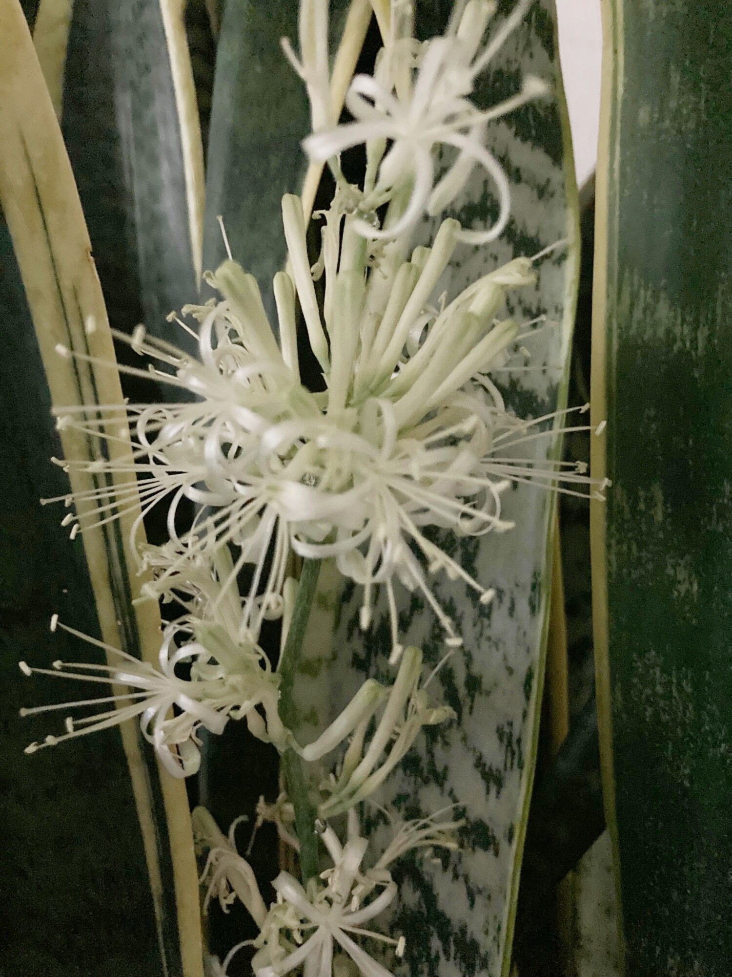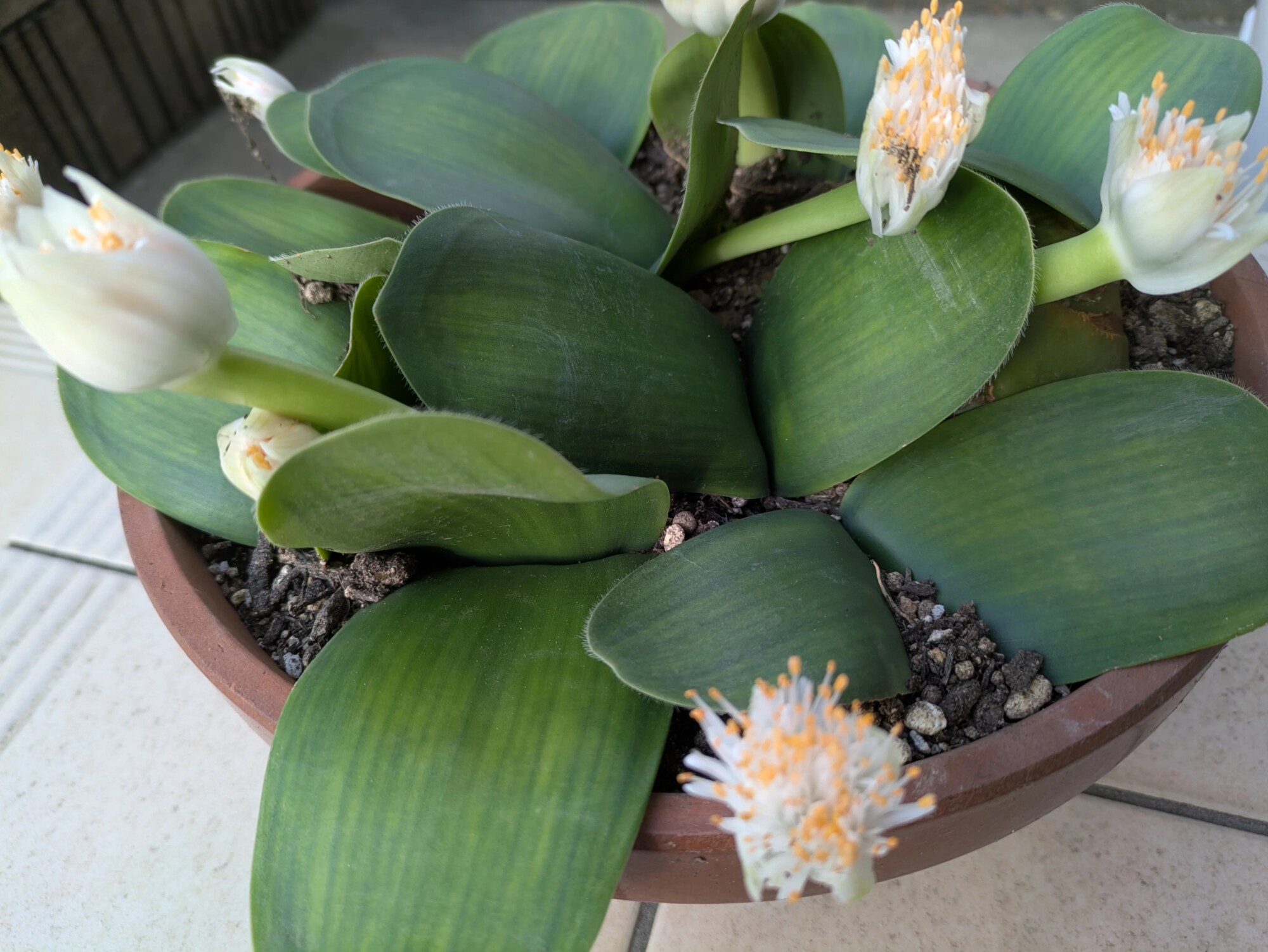 白い丸い刷毛の様な花が咲き、肉厚の葉で育てやすく、増えます。 名前はオモトですがヒガンバナ科らしいです。(マシュマロ)