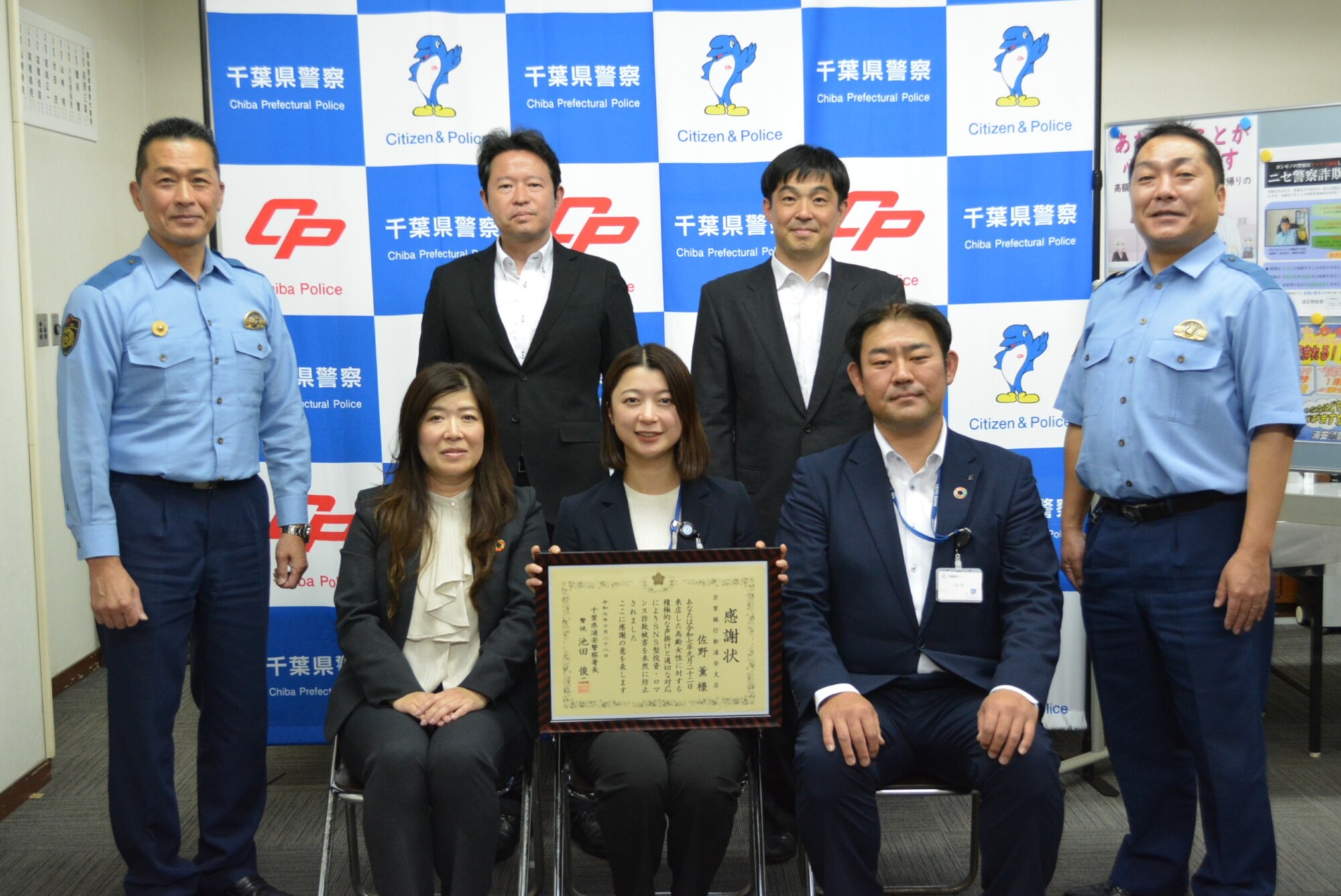 浦安警察署(池田俊二署長)は、SNSによる投資詐欺被害を未然防止した功労で10月28日(火)、同署内で、京葉銀行行員の佐野薫さんに感謝状を贈呈した。