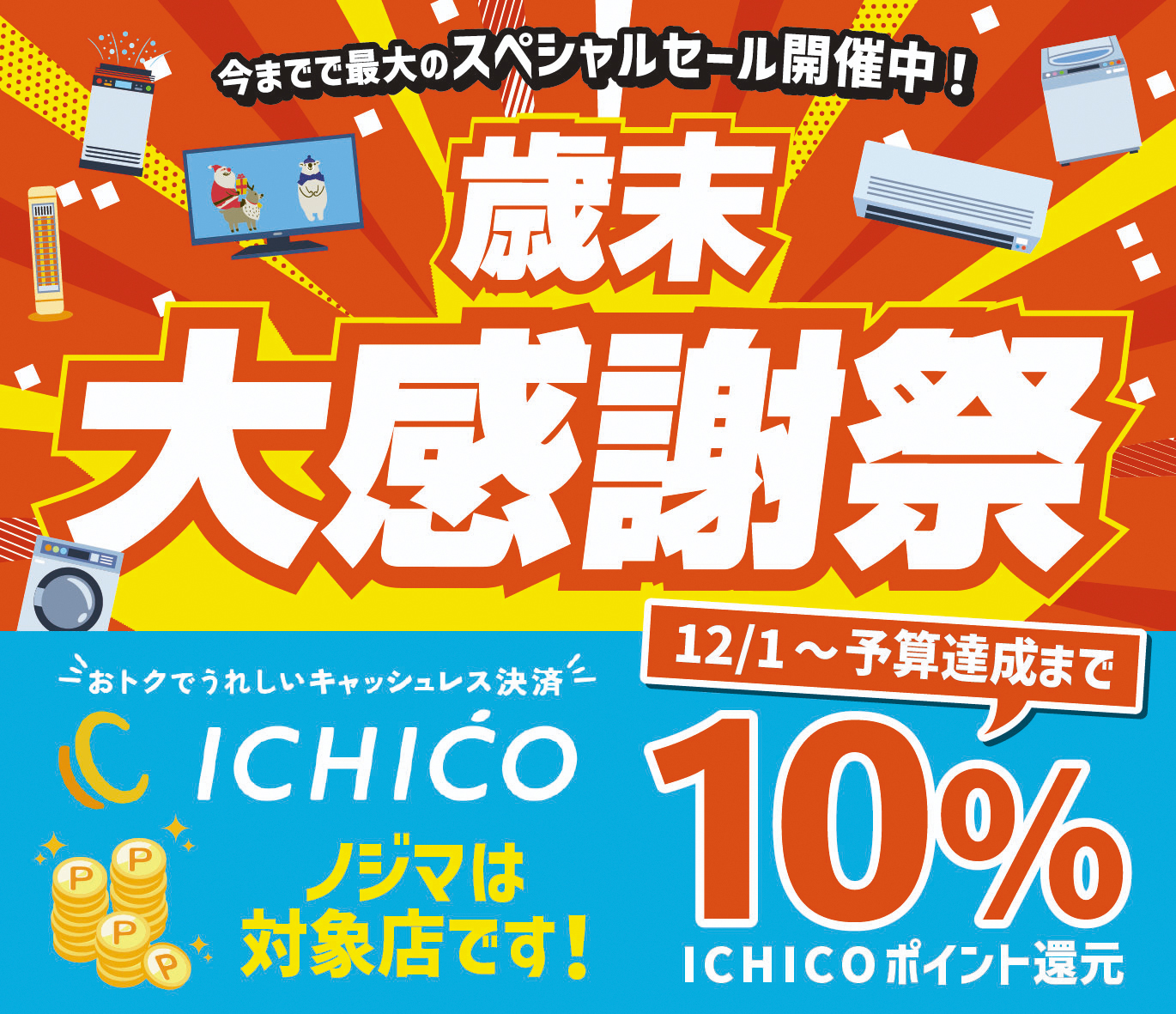 ダイエー市川店6階の家電専門店「ノジマ市川駅前店」で「歳末大感謝祭」が開催されている。「今年最大のスペシャルセールです」とスタッフ。