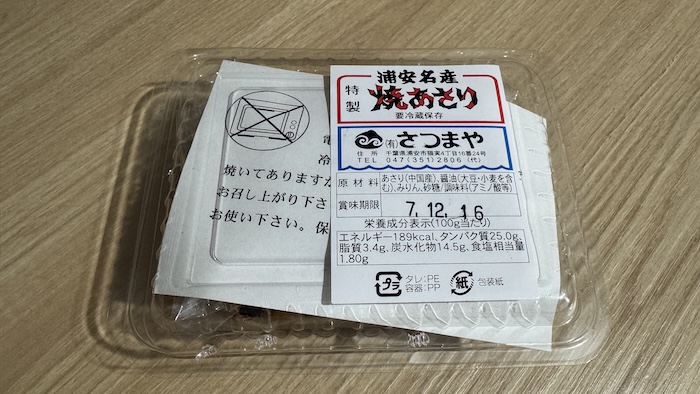 浦安らしい名物土産として外せないのが、さつまや焼蛤本舗の「焼きあさり」。今回は自宅用パックで焼きあさり10本(1本65円)を購入しました(※はまぐりは1本195円で、贈り物用の箱詰めセットも選べます)。