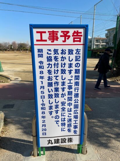 遊具が新しくなって、子どもたちが元気に遊んでいる南行徳公園で、1月~2月に広場の工事が行われるようです。