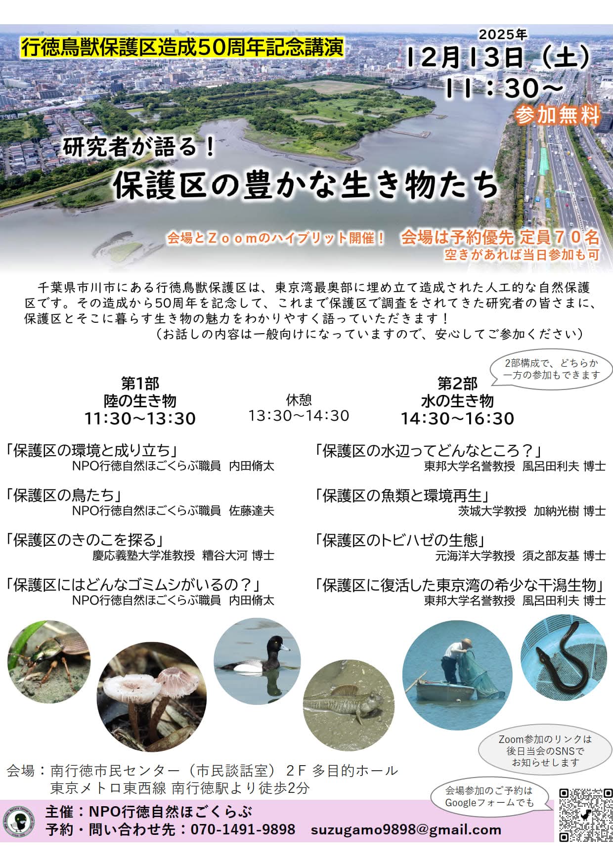 行徳鳥獣保護区造成から50周年を記念して開催されたもので、保護区で生息する多種多様な生き物の魅力を知ってもらおうと、保護区の環境保全や研究活動を行うNPO行徳自然ほごくらぶが企画した。