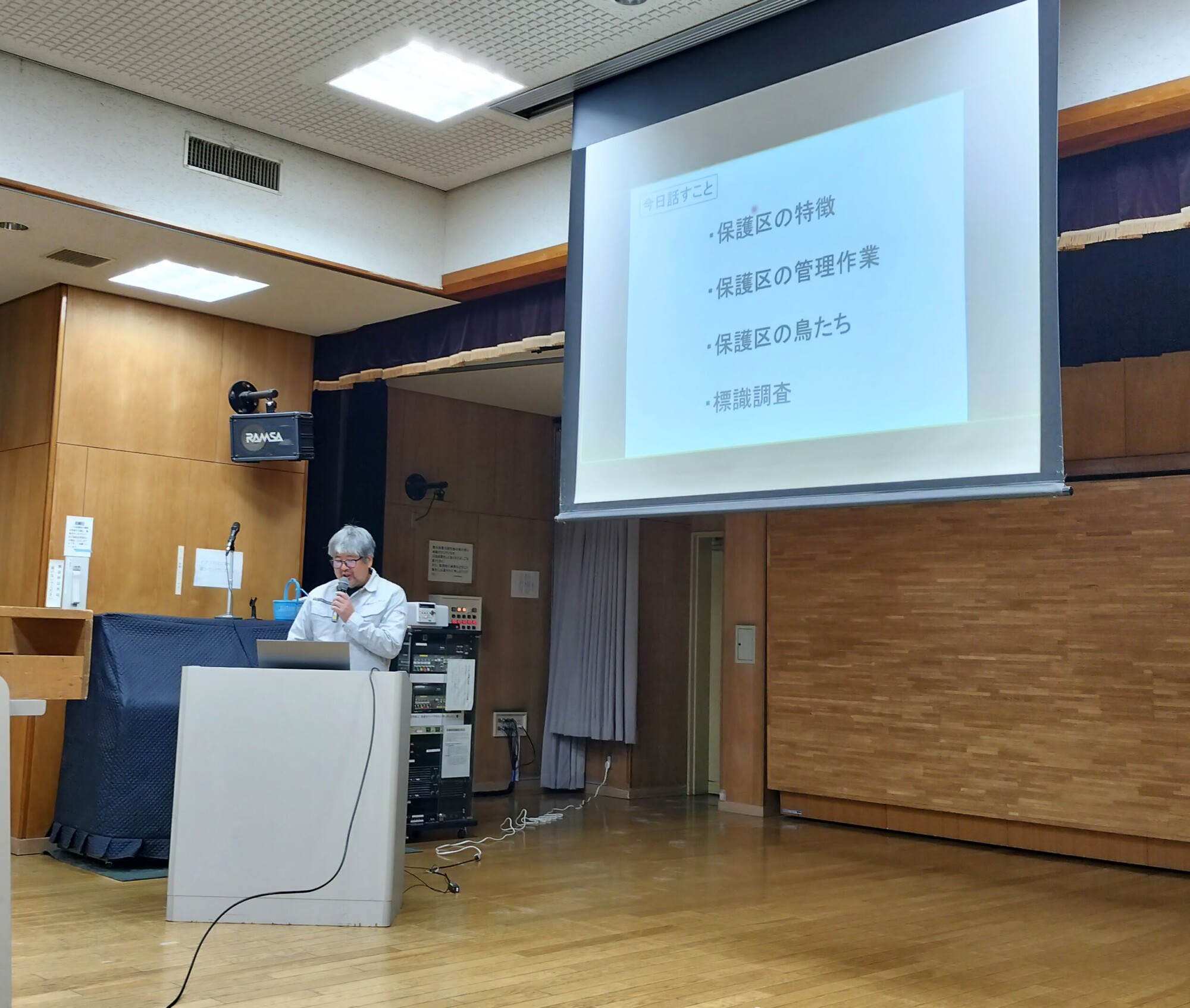 保護区の成り立ちについての話から始まった講演会は2部制で行われ、、1部では陸の生き物、2部では水の生き物をテーマに、ほごくらぶの職員や大学研究者が解説した。