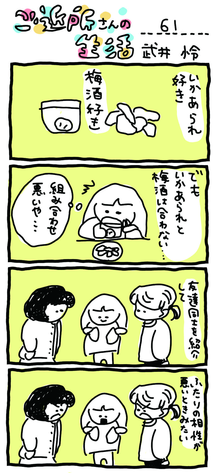 いかあられ、という、おつまみみたいなやつを、おっかが、いつも行くスーパーマーケットで、買ってきてくれました。そのスーパーマーケットには、他のスーパーマーケットでは見かけない、梅水晶という、梅肉と、なんこつを混ぜた、おつまみのやつも売っていて、いいおつまみのセンスしているな、と思います。いかあられとは、さきいかが、飴みたいなやつにからめられた、べたべたする、甘めのさきいか、という感じの、おつまみのやつです。いかあられを初めて食べた日から、私は、いかあられが大好物になりました。私は、梅酒も大好きです。私は、梅酒のおつまみに、いかあられを食べよう、と、楽しみにしていました。そして、いよいよ、いかあられと梅酒の、素晴らしい役者がそろった夜に、私に、ちょっとした悩みができてしまいました。私は、いかあられも、梅酒も、どちらも、とってもおいしいな、と思います。だけど、梅酒を飲みながら、いかあられを食べると、梅酒を、おいしいな、と、そんなに感じなくなるし、いかあられも、おいしいな、と、あんまり感じなくなるな、と思ってしまいました。私は、このまま意地で、無理やりにでも、いかあられと梅酒を、同時にたしなんでいたら、いかあられも梅酒も、両方とも、私にとって、そんなに好きじゃないものになりそうだな、と思ったと思います。だから私は、いかあられと梅酒、両方とも大好きでも、一緒には合わせないようにしなければなりません。このことが悲しいし、ちょっとした悩みです。私は、このことが、私の友達同士を、私が紹介したときに、その友達同士が、気が合わなくて、嫌な空気になったから、3人で遊べたらいいなと思っていたのに、それが叶わなさそうだな、と思う、みたいなやつに似ているな、と思いました。