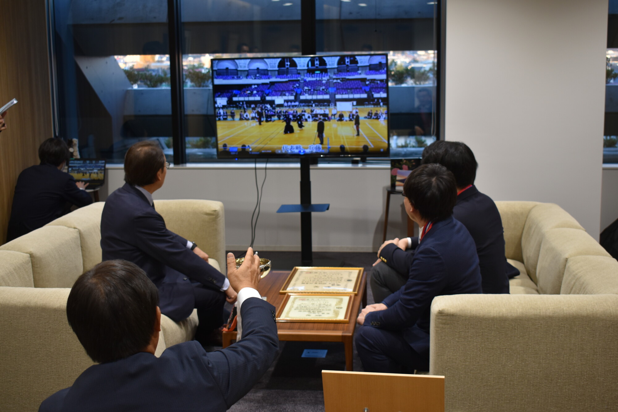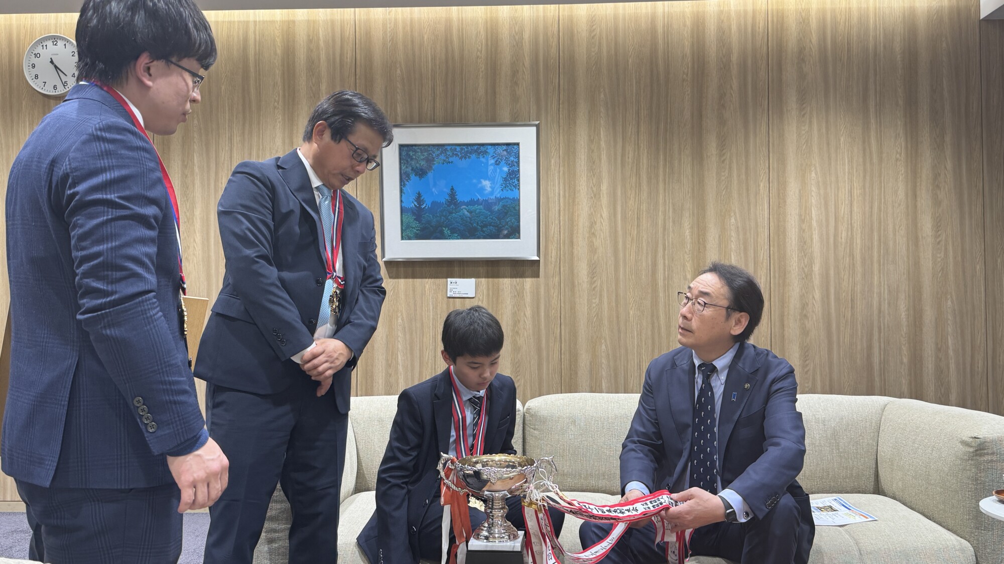 表敬訪問には中山憲司監督のほか、先鋒・権瓶珀人選手(小学6年)、中堅・山野慎治選手(大学4年)、副将・兵藤裕則選手が出席。権瓶選手は「もともと自信があって大会に臨んだ」そうで、中学・高校でも剣道を続けたいという。山野選手は「決勝で自分は敗れた。でもチームでは勝てて、うれしさと悔しさの両方がある」と語り、社会人になっても競技を続ける意向を示した。兵藤選手は「個人としては決勝にくるまで全然勝てなかった。みんなに連れてきてもらった決勝だから何とかしたいと思い、頑張った結果最後勝つことができた」と試合を振り返った。