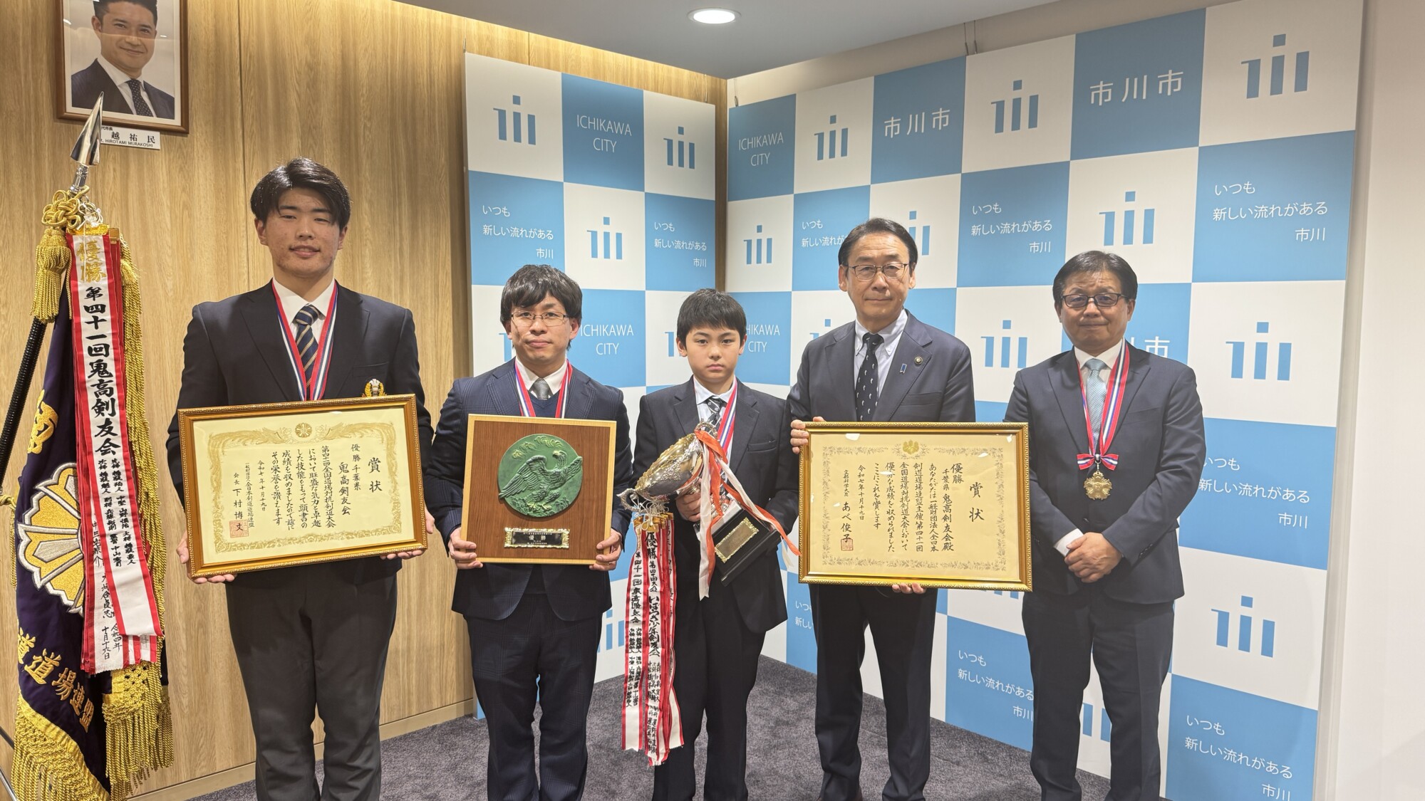 市立鬼高小学校を拠点とする鬼高剣友会が、10月19日(日)に開催された「第41回全国道場対抗剣道大会」で優勝し、12月5日(金)、市川市役所を表敬訪問した。