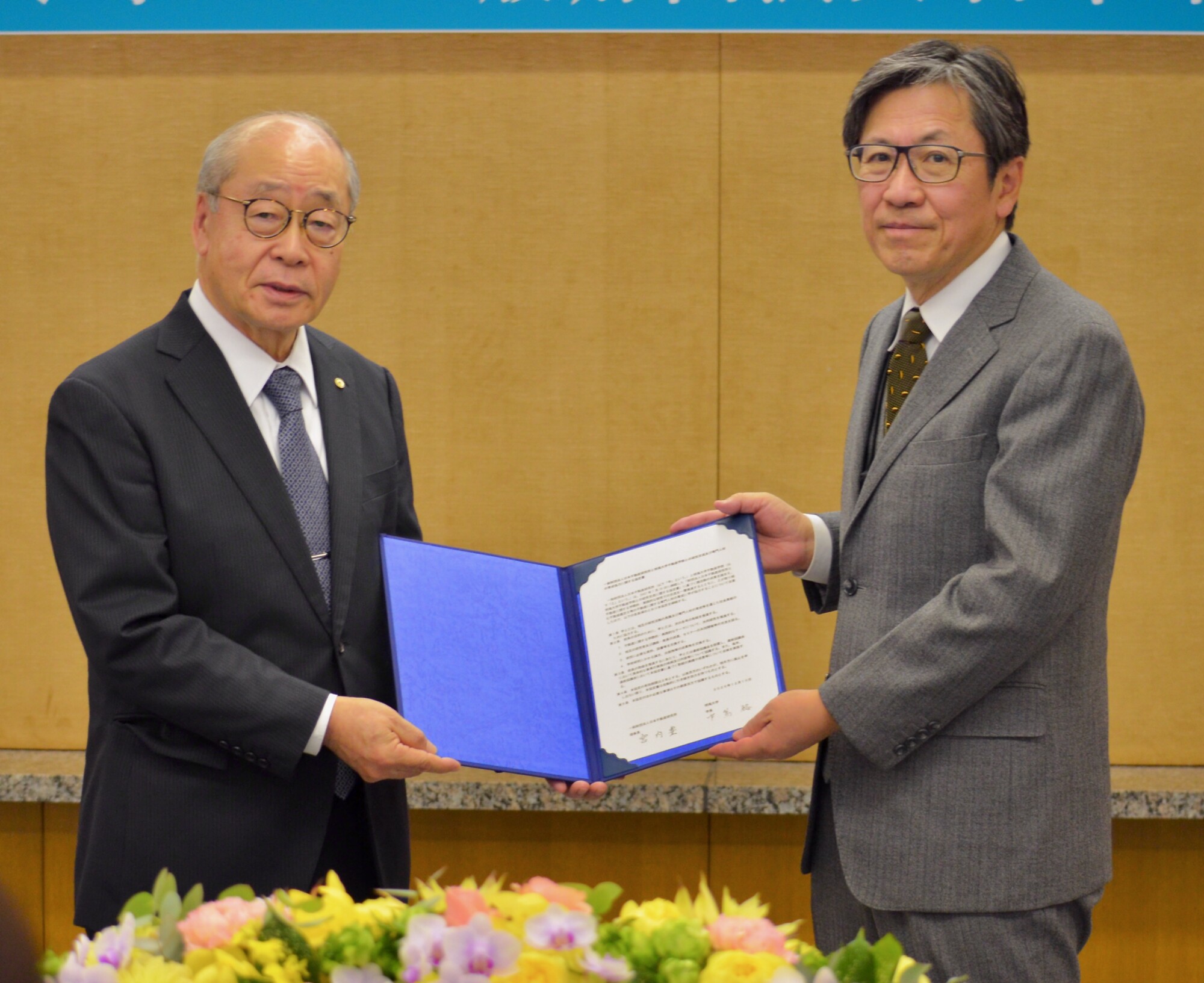 明海大学の中嶌裕学長(写真左)は「学生にはさらに高度で実践的な学びの場が提供され、研究所においては、次世代を担う人材との接点がもたらされる。双方にとって大きな価値を生み出すものとなることを希望する」と述べ、宮内豊日本不動産研究所理事長(写真右)は「都市再開発や地方創生、不動産の証券化やマーケットの国際化などによって、最新の知識、技術に基づく適正な不動産鑑定の需要はますます拡大している。研究交流をさらに深め、両者のより一層の発展に繋げていきたい」と続けた。