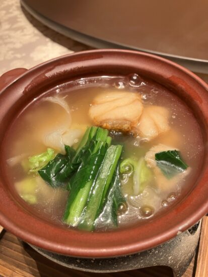 味わい深い焼き豚、クラゲの冷菜などの前菜から始まり、ずわい蟹入りふかひれスープ、香ばしい北京ダック、ふかひれ×クエ×やまぶし茸の滋味深い土鍋煮込み。土鍋煮込みの子魚豆豉醤がクセになる。国産牛サーロインと発酵唐辛子の魚香炒めもお肉の甘みがたまりません。贅を尽くした構成だけど、重くならず、最後まで美味しく味わえるのです。九条葱と広東叉焼の汁そばで締めてデザートにはぜひ、薔薇が香るプレミアム杏仁豆腐を。自分へのご褒美ディナーにぴったりです。