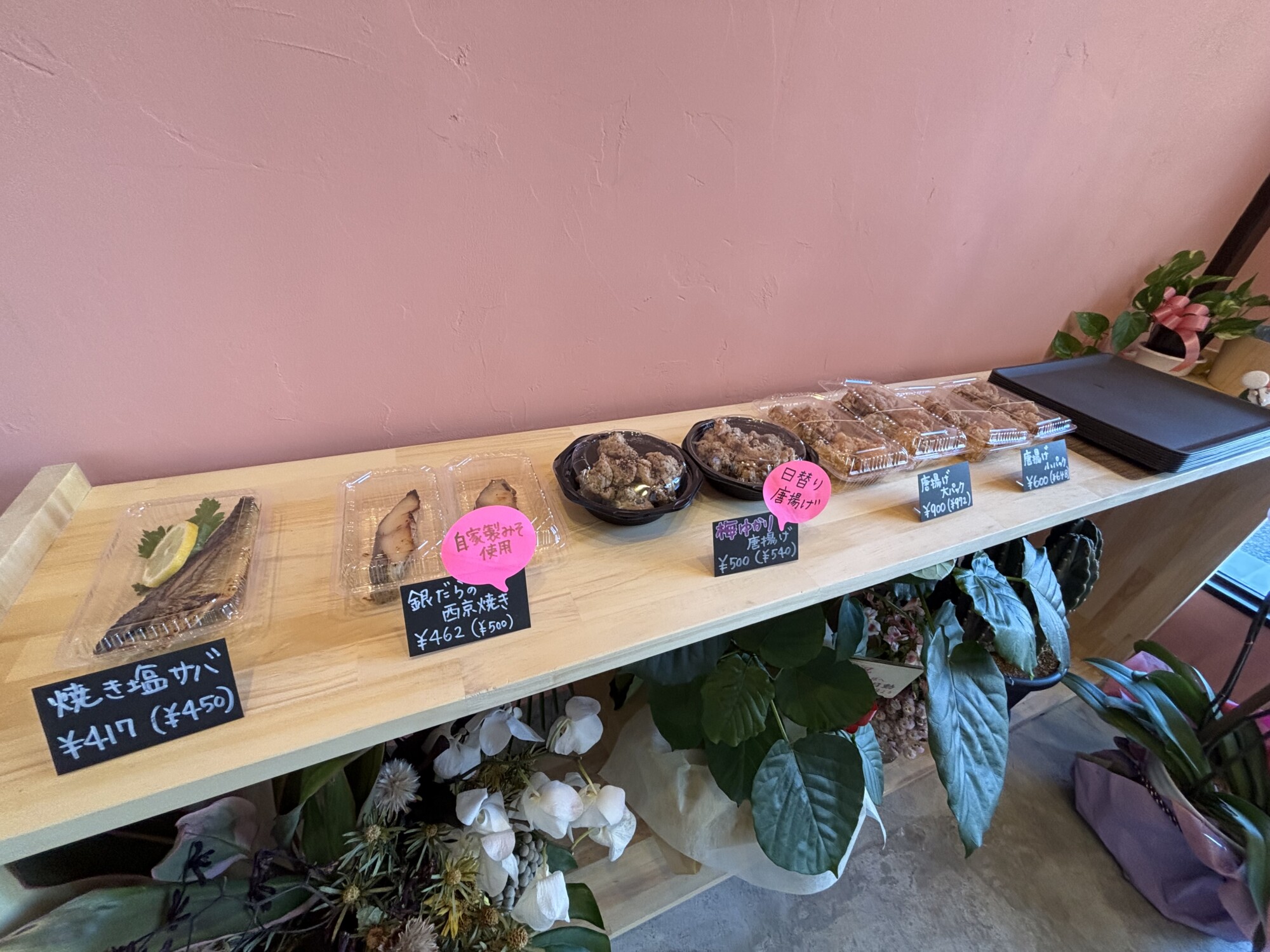 店内のカウンターには唐揚げ弁当や銀だらの西京焼き弁当をはじめ、きんぴらごぼう、ひじきの煮物やおからなど、和を中心とした日替わり総菜がずらり。