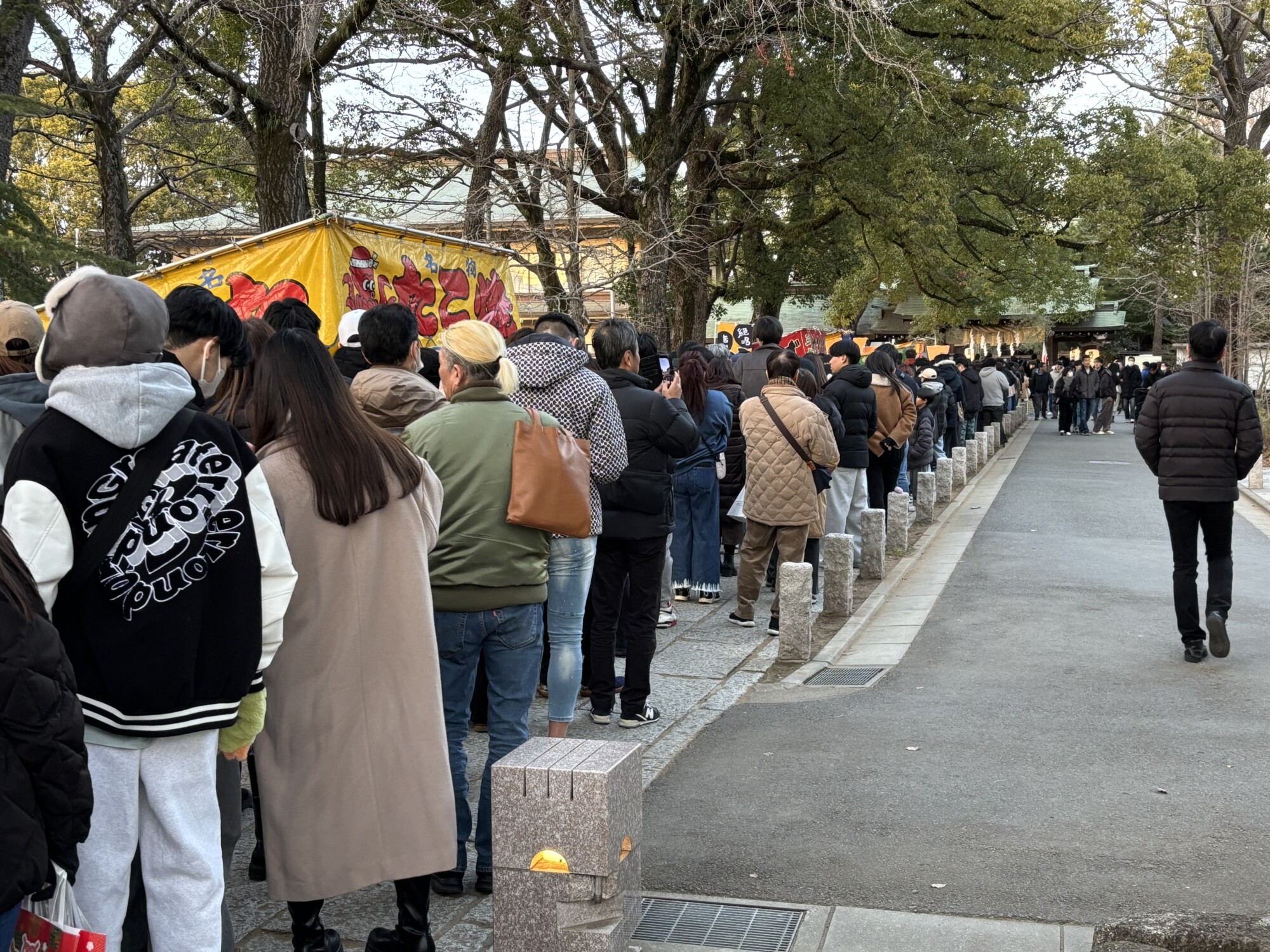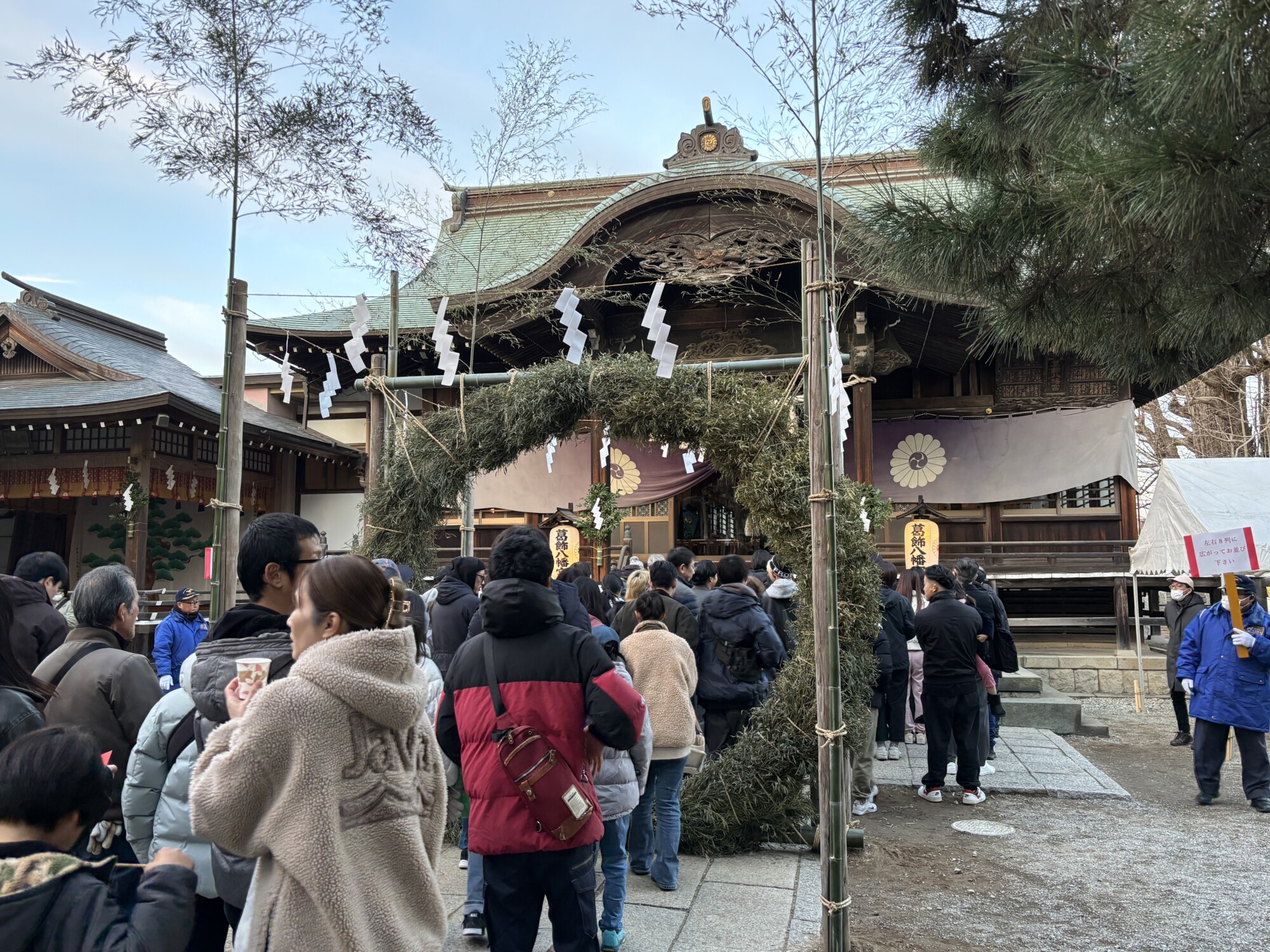境内入口から続く参拝者の列は、駐車場を曲がった先まで伸びていました。