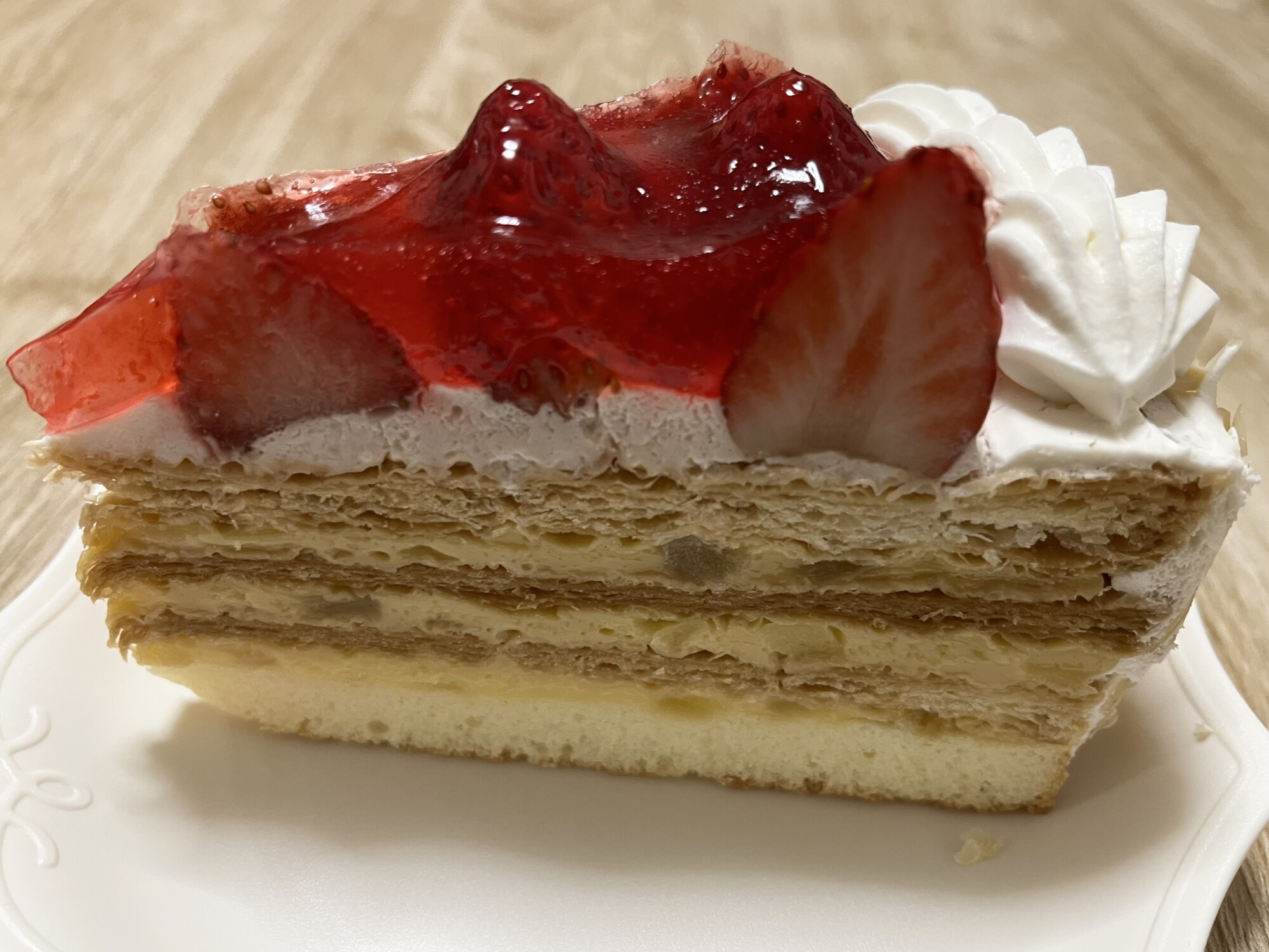 たっぷりの甘い生クリームやカスタードがアーモンドの香ばしさと、上面の苺の甘酸っぱさを引き立ててくれています♪