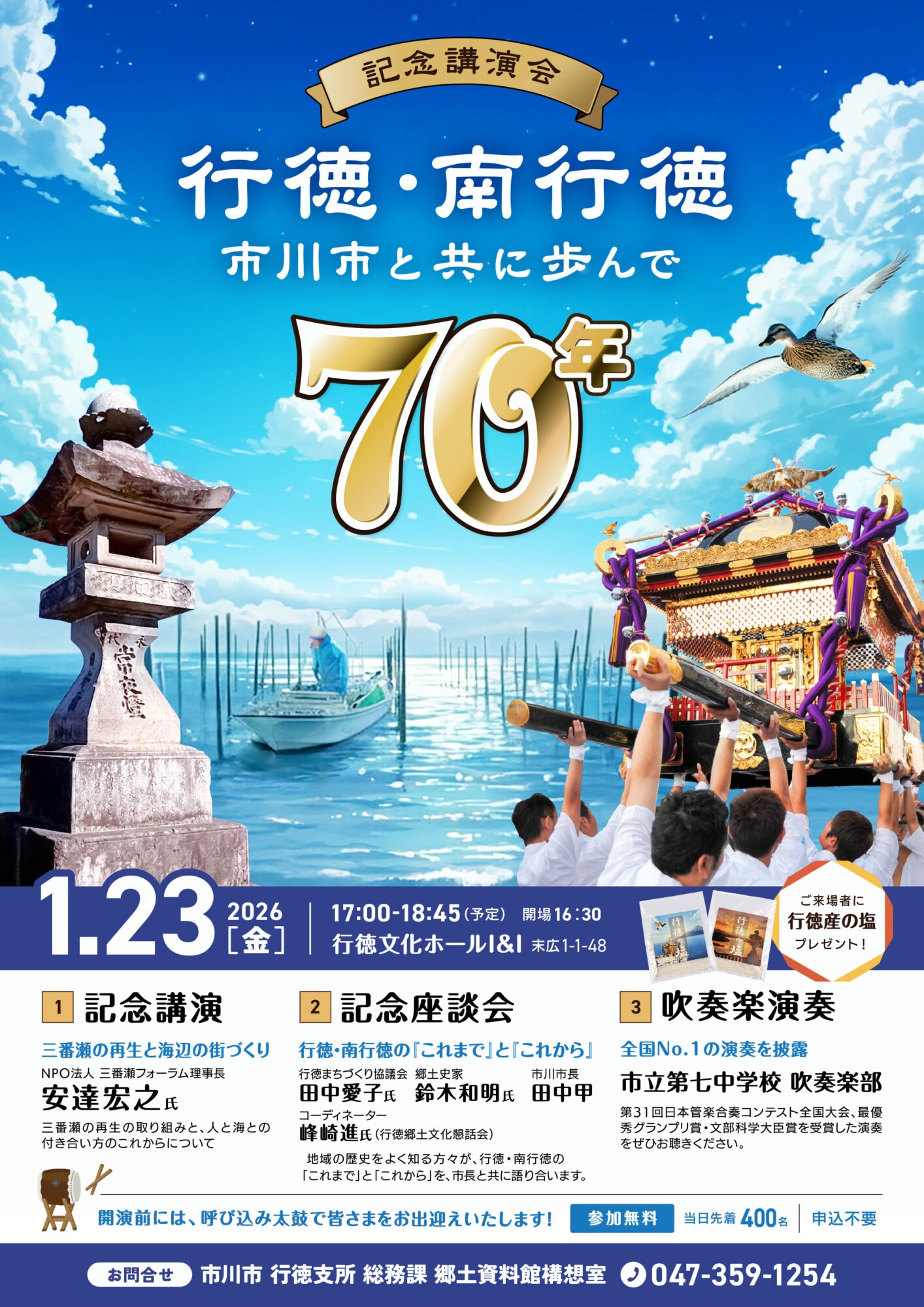 「行徳・南行徳 市川市と共に歩んで70年 記念講演会」が1月23日(金)、行徳文化ホールI&Iで開催される。