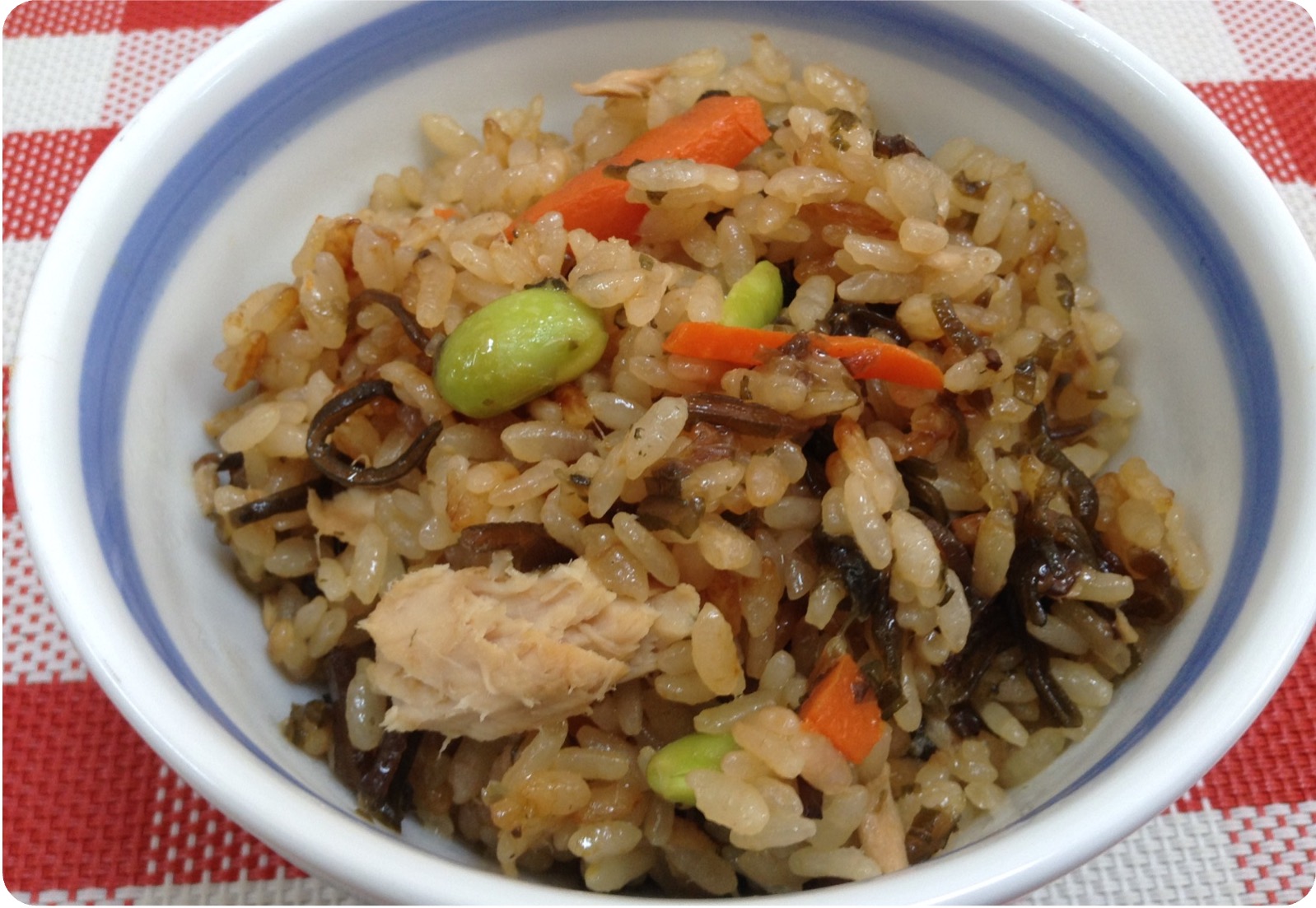 ③炊飯器に①の米と水、めんつゆ、酒を入れ混ぜる。そこへ②、まぐろ油入り水煮、塩こんぶ、むき枝豆を入れて普通炊飯で炊く。