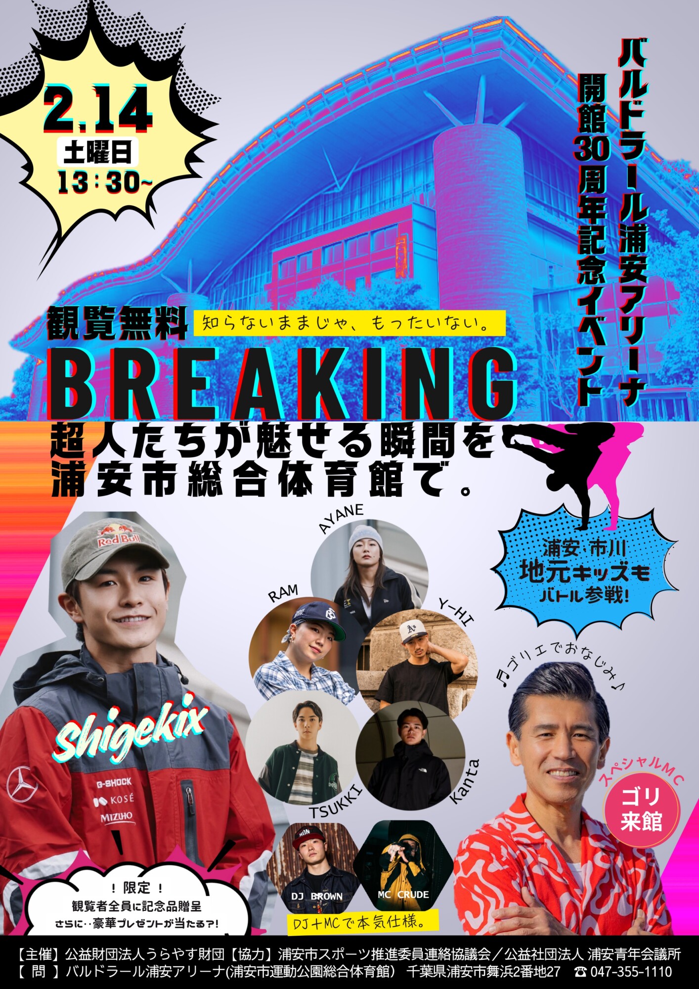 浦安市舞浜にあるバルドラール浦安アリーナ(浦安市運動公園総合体育館)で、開館30周年を記念した特別イベント「BREAKING(ブレイキン)」が開催されます。