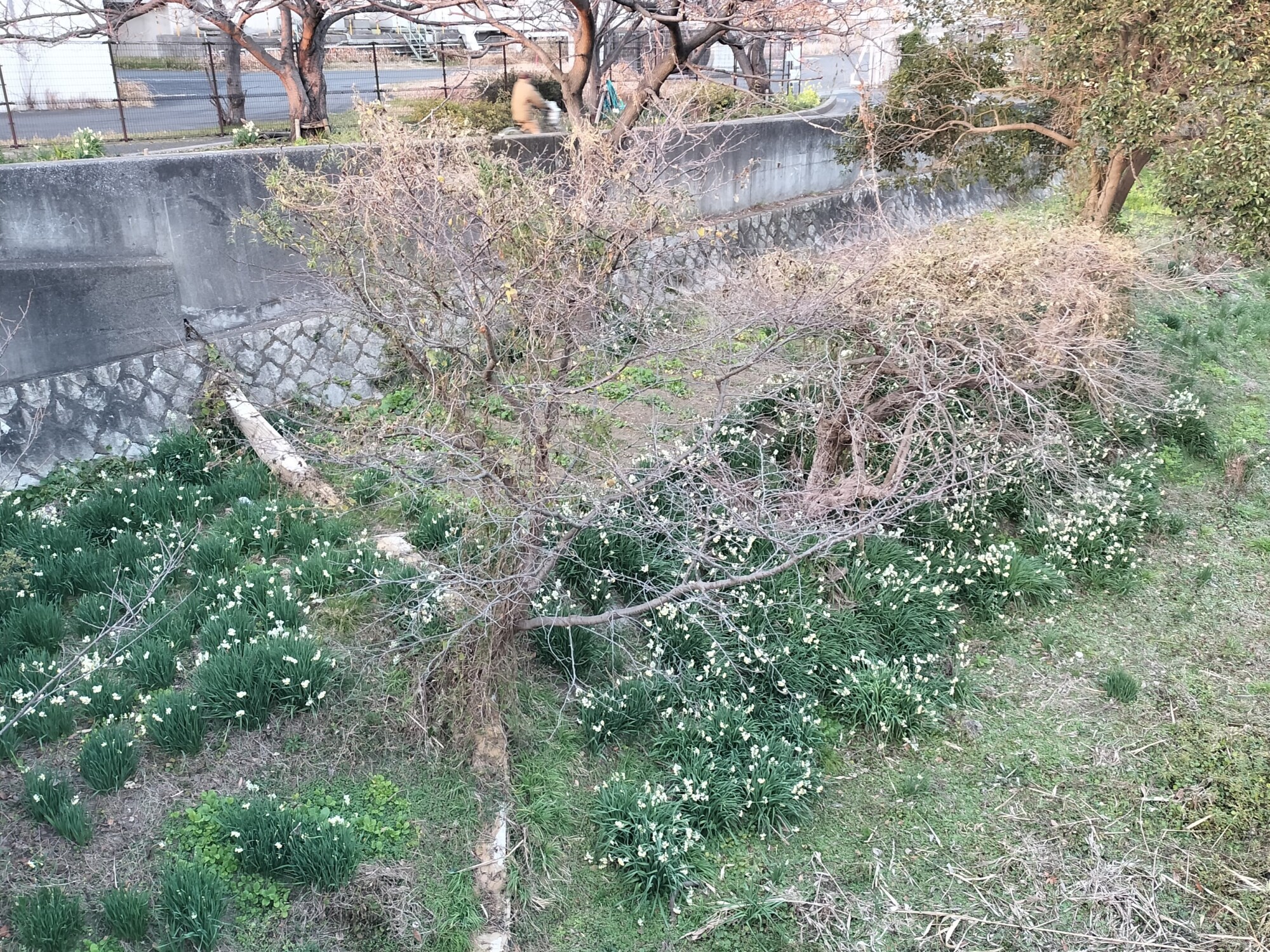 塩浜橋から見ると猫実川の土手沿いにたくさんの水仙が群生していて見事!是非橋の上から見て欲しい。