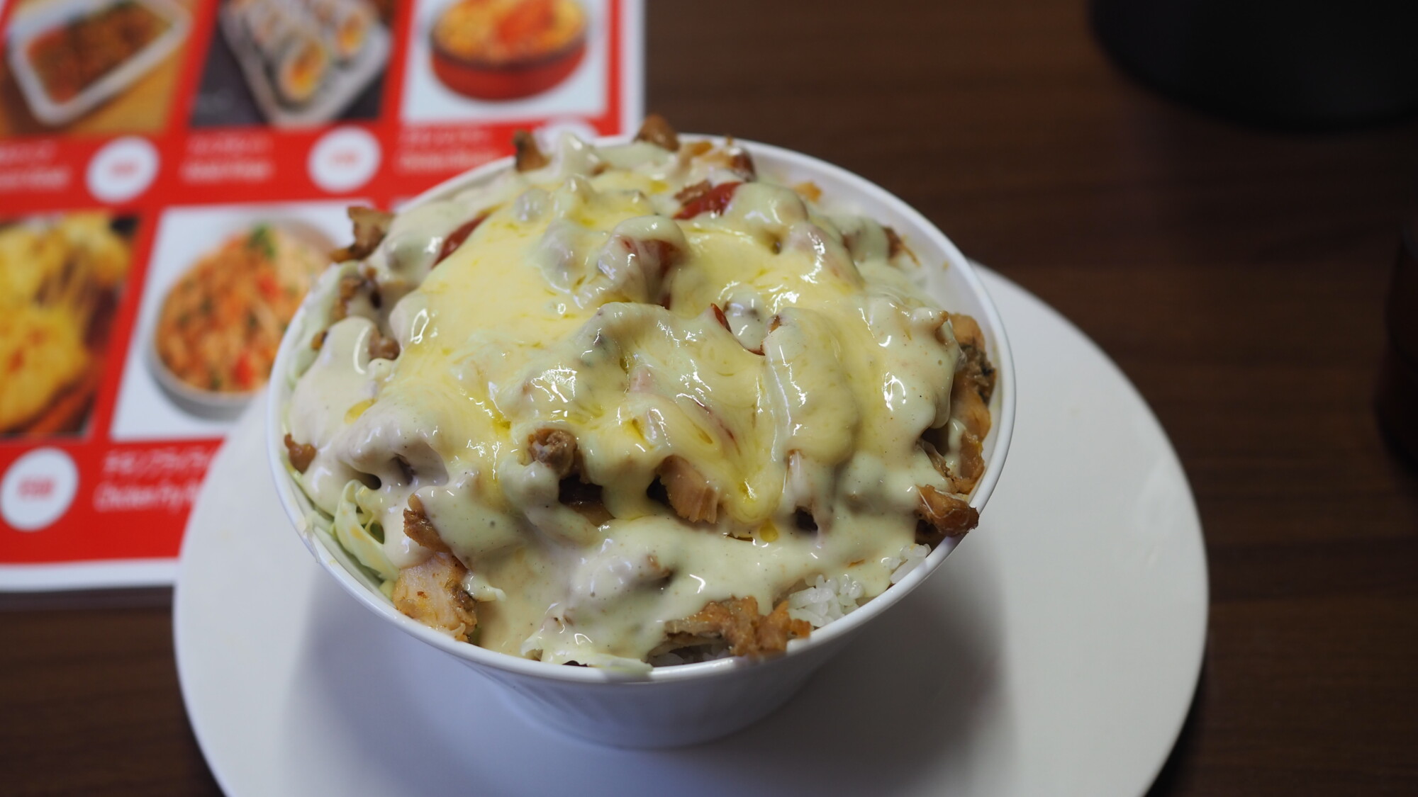 チキンチーズカバブ丼という面白そうなメニューを頼んでみたら、器に盛り盛りのハイカロリーな一杯が出てきました。