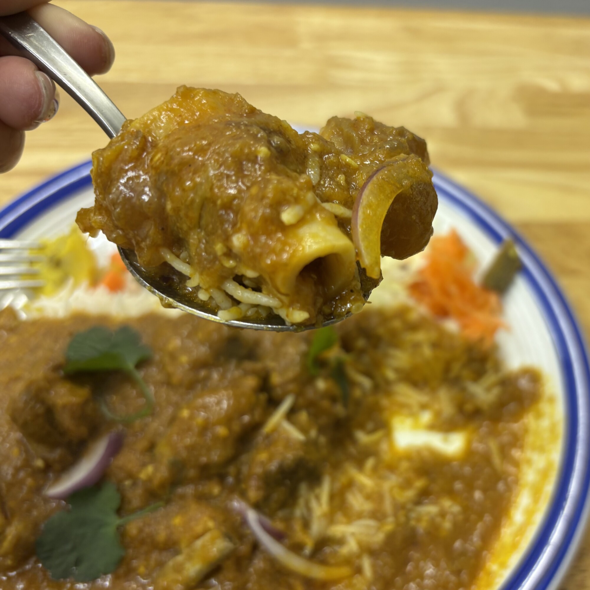 今回いただいたのは、ゴロゴロとしたお肉が目を引く**「マトンカレー」**です