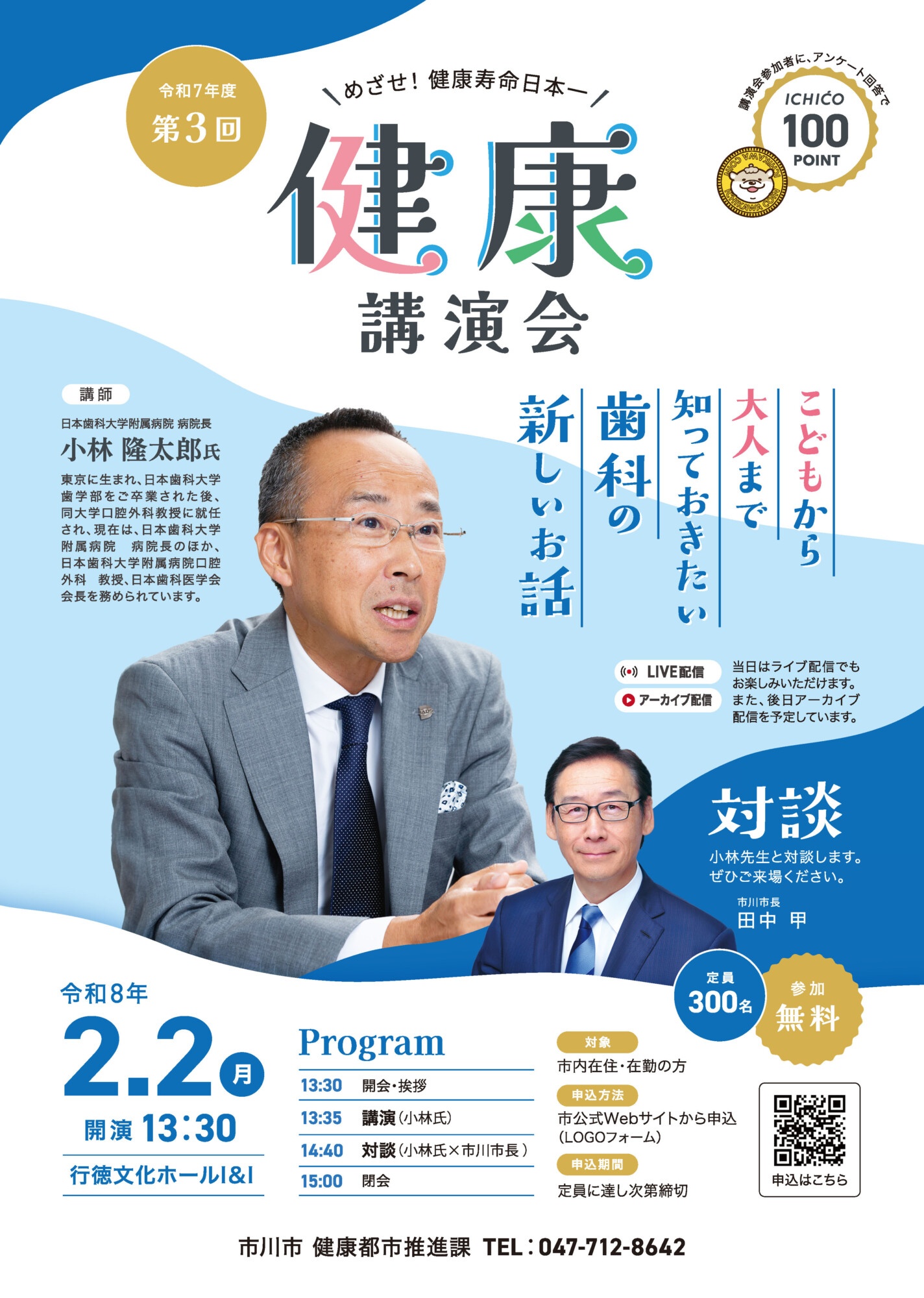 講演後は小林氏と田中甲市川市長の対談も予定されており、こちらも必聴。また参加者には、アンケート回答で「ICHICO」100ポイントのプレゼントがあり、健康のことを考えながらちょっぴりお得もゲットできるのがうれしい。