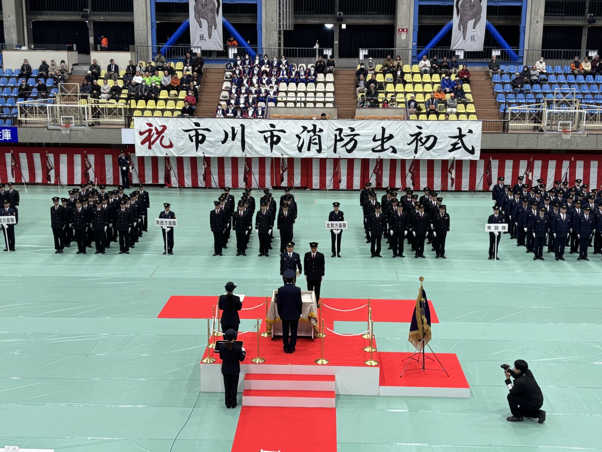 1月10日(土)、国府台市民体育館で、市川市消防出初式が開催された。消防団員や消防職員、協力団体のほか、地元選出の国会議員、県・市議会議員が出席し、多くの一般来場者が見守る中、厳かな雰囲気で式典が行われた。