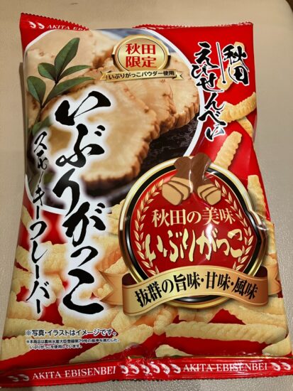 初めて見かけた秋田えびせんべいはスモーキーでたしかにいぶりがっこ味、食べたらクセになる!!