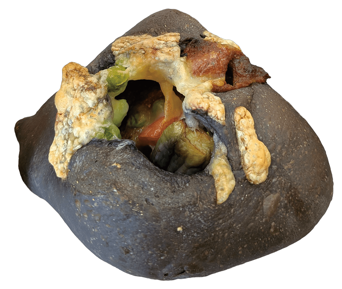 イカ墨入りのシンプルパンに、ビーフカレーを包み込み、トマト・ナス・チーズなどをトッピングした個性派カレーパン。驚きの見た目と味の完成度、どちらも楽しめる一品です。