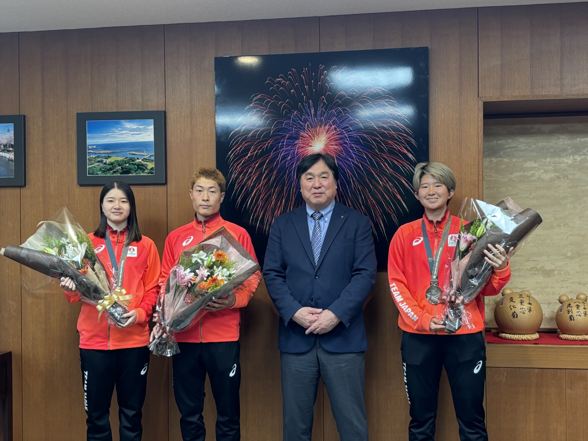 12月24日(水)、東京2025デフリンピックに日本代表として出場した江戸川区ゆかりのアスリートが斉藤猛区長を訪問し、大会の結果を報告した。