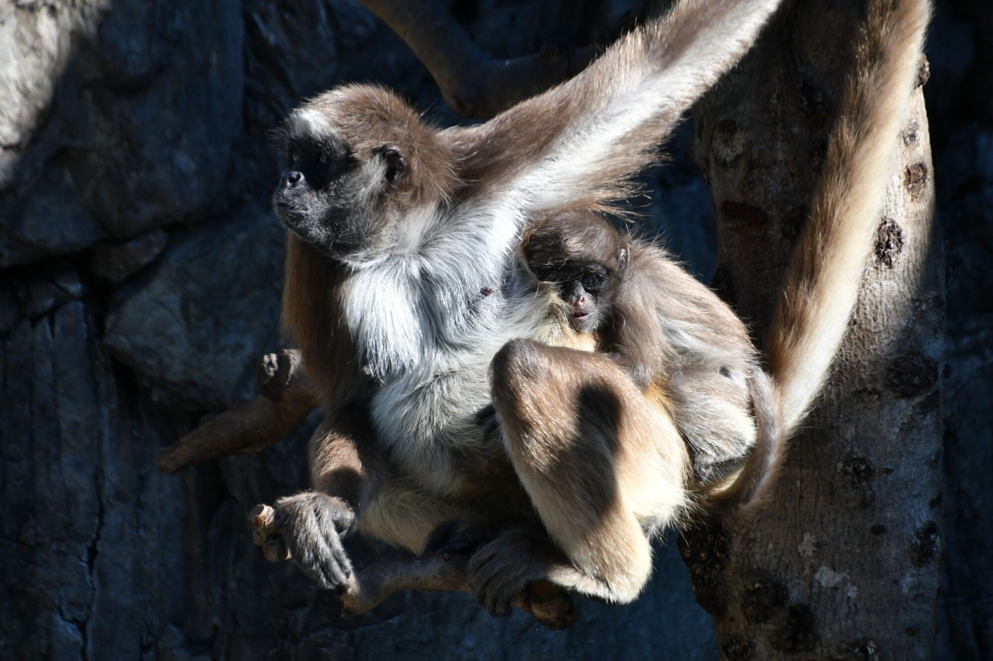 江戸川区自然動物園でブラウンケナガクモザル(絶滅危惧種レッドリスト指定)の双子の赤ちゃんが昨年7月に誕生。祖母に育てられすくすくと成長している。中型霊長類であるクモザルにとって双子が生まれることはまれで、また祖母が授乳を含めた育児を担っていることは大変珍しい例だという。