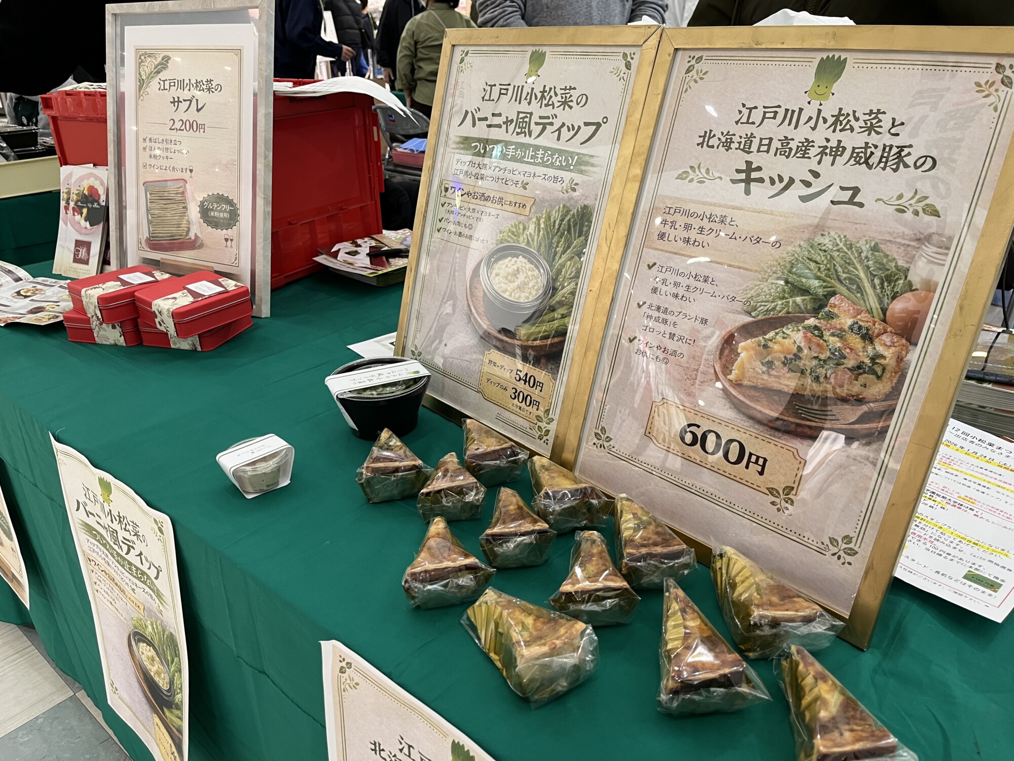 店内へ進むと、小松菜を使った食べ物やスイーツの販売ブースが広がっています。 「小松菜スタンプラリー」対象店舗の自慢の商品が集結しており、会場でスタンプシールを集めることも可能です。