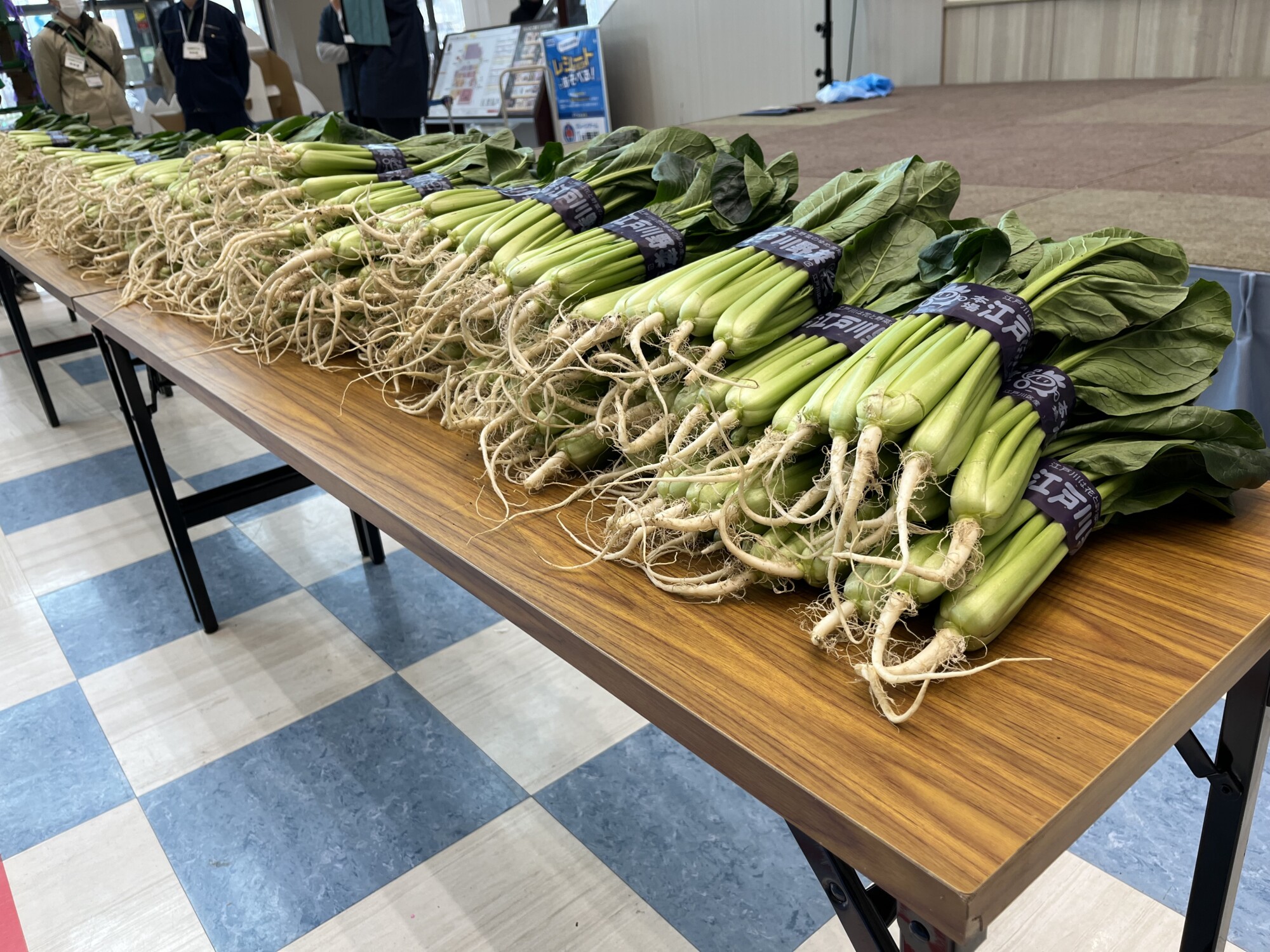 正面入口からすぐのステージ横に現れたのは、全て江戸川区産の小松菜でつくられた「小松菜タワー」! なんと200束、2メートルの高さがあるそうです♪