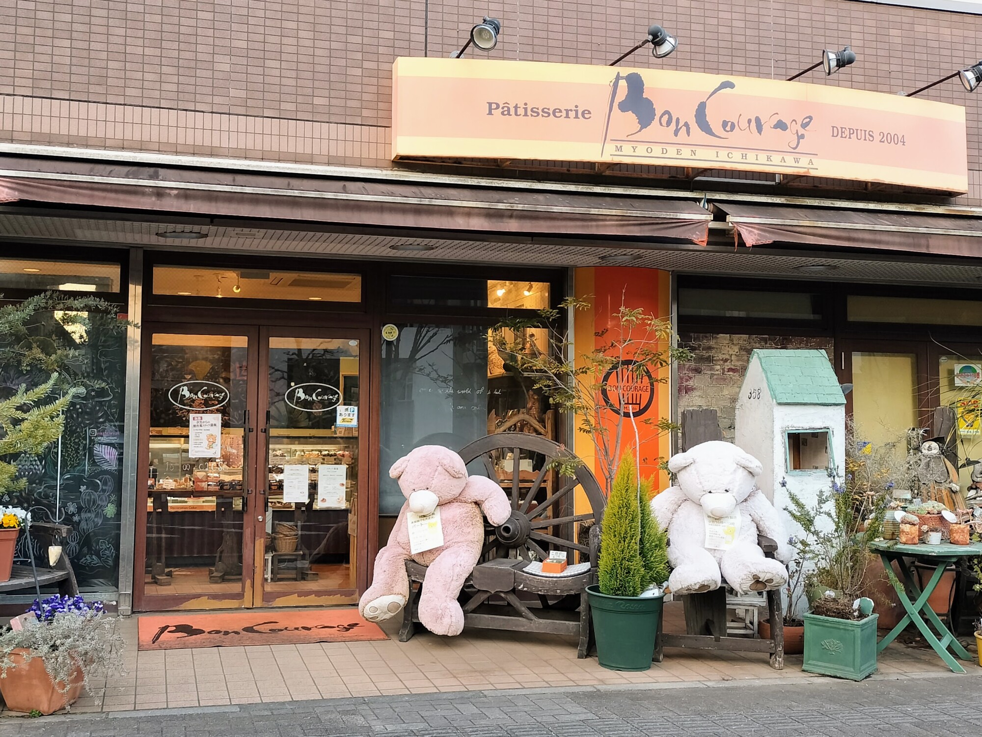 市川市妙典の住宅街に佇む、人気のケーキ屋さん「パティスリー ボン・クラージュ」 。 店先の大きなクマのぬいぐるみが目印のこちらのお店では、バレンタインシーズンに合わせて魅力的なショコラ系スイーツが豊富に並んでいます 。