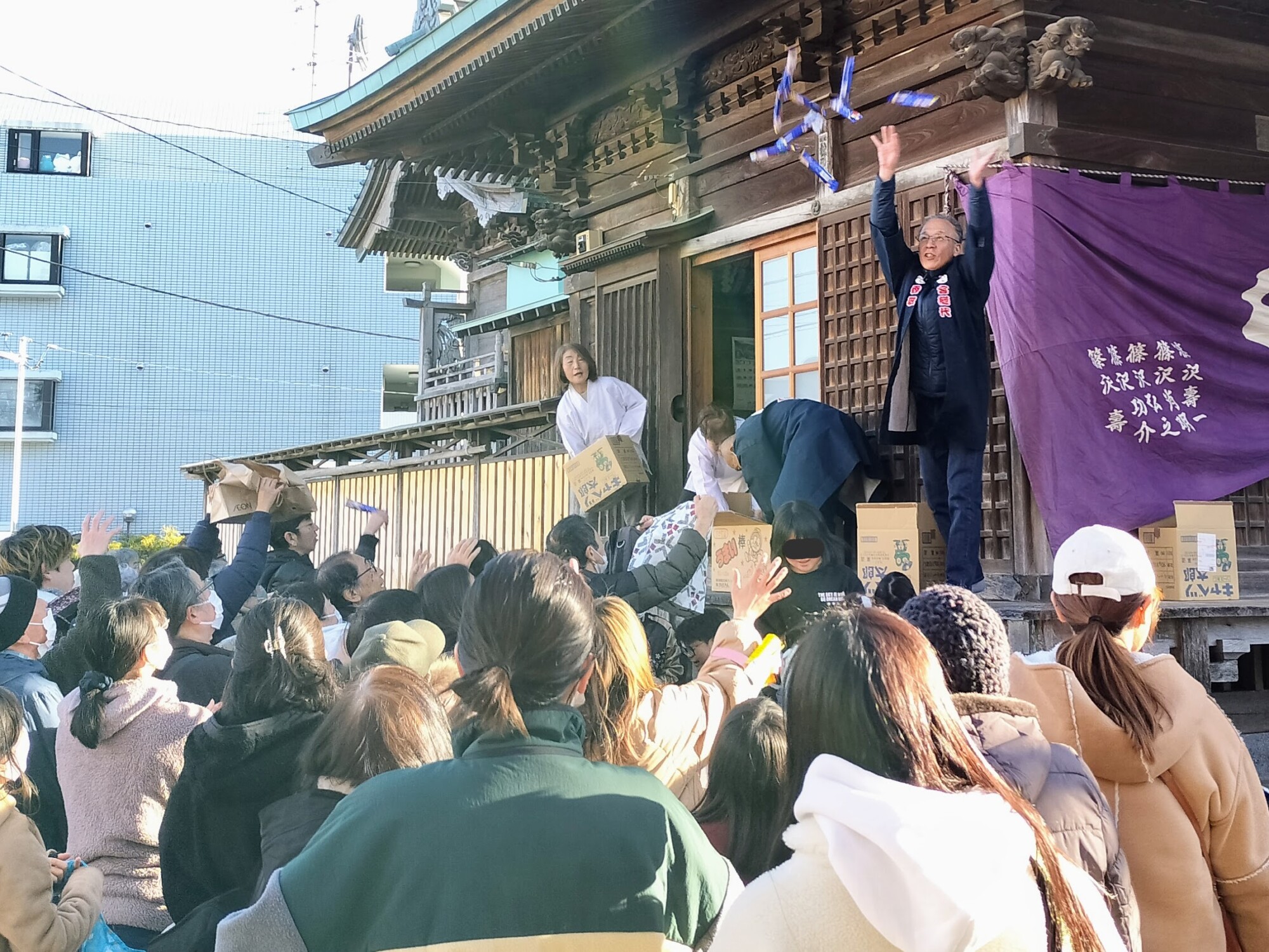 豆まきは、災厄や邪気を払い、福が舞い込むようにと願って行われる伝統行事です 。 投げられたのは、福豆の入った小袋や色とりどりのお菓子 。