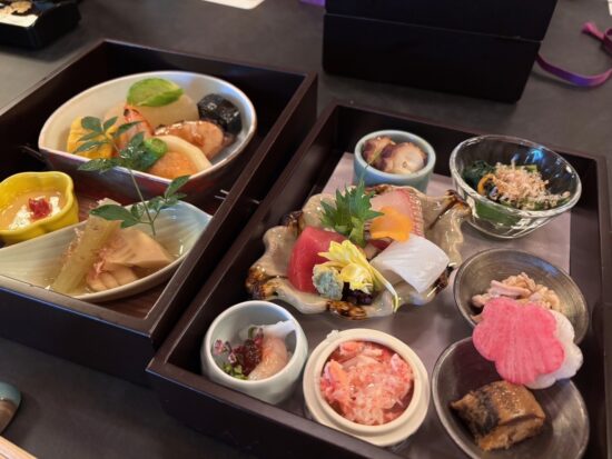玉手箱のような二段重に、美しい料理がぎっしり詰まってる! この一つひとつがどれも味わい深い。たけのこやフキ、山菜など季節の食材を使った料理に春の訪れを感じつつ、箸が進む進む…。普段はめったに食べない締めの炊き込みご飯と、甘味もしっかりいただき満腹。たまにはホテルでの食事もいいなぁと実感。とってもおいしゅうございました。