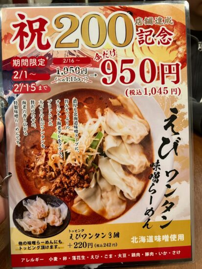 海老の香りがふわりと香る「えびワンタン味噌らーめん」が期間限定でお安くなってます!