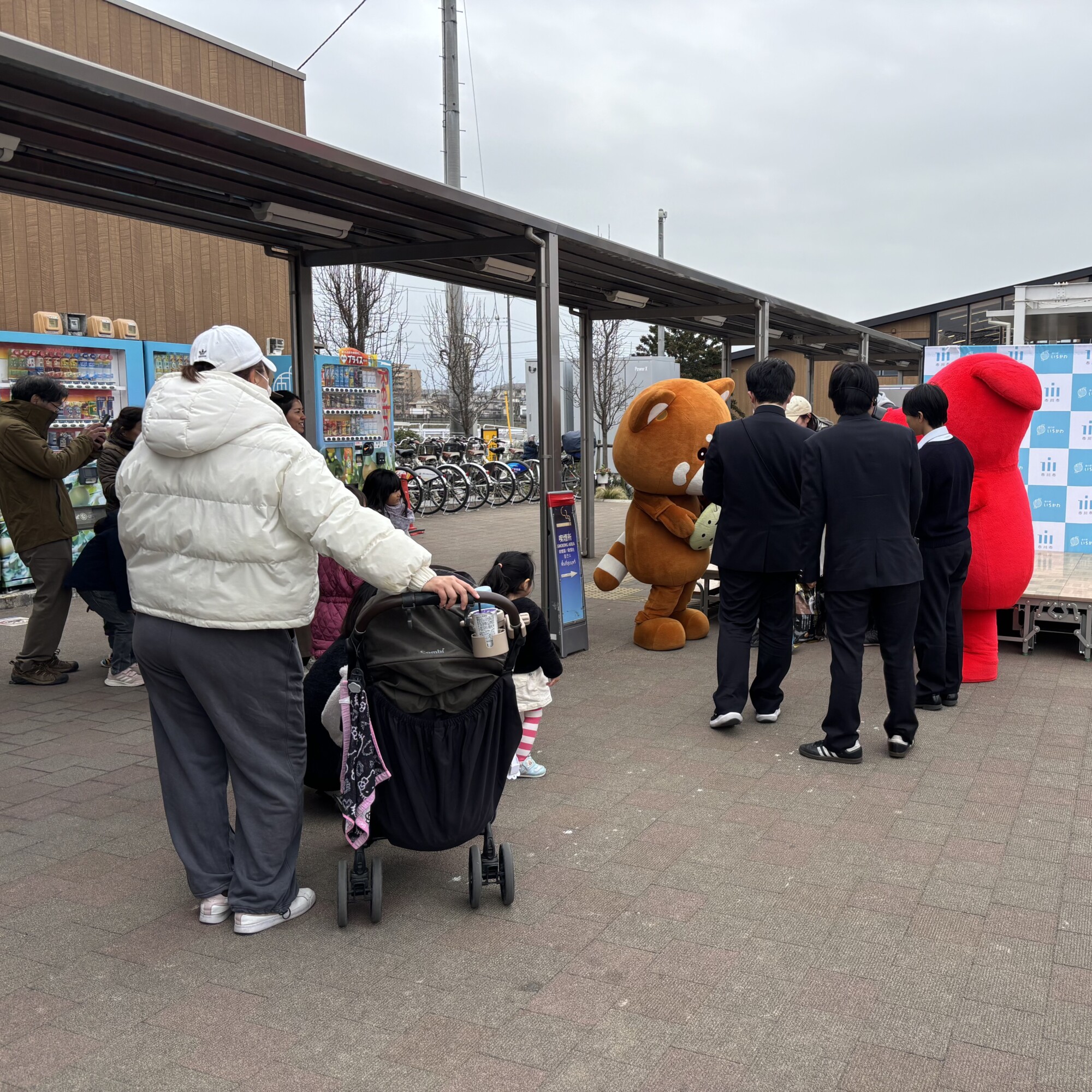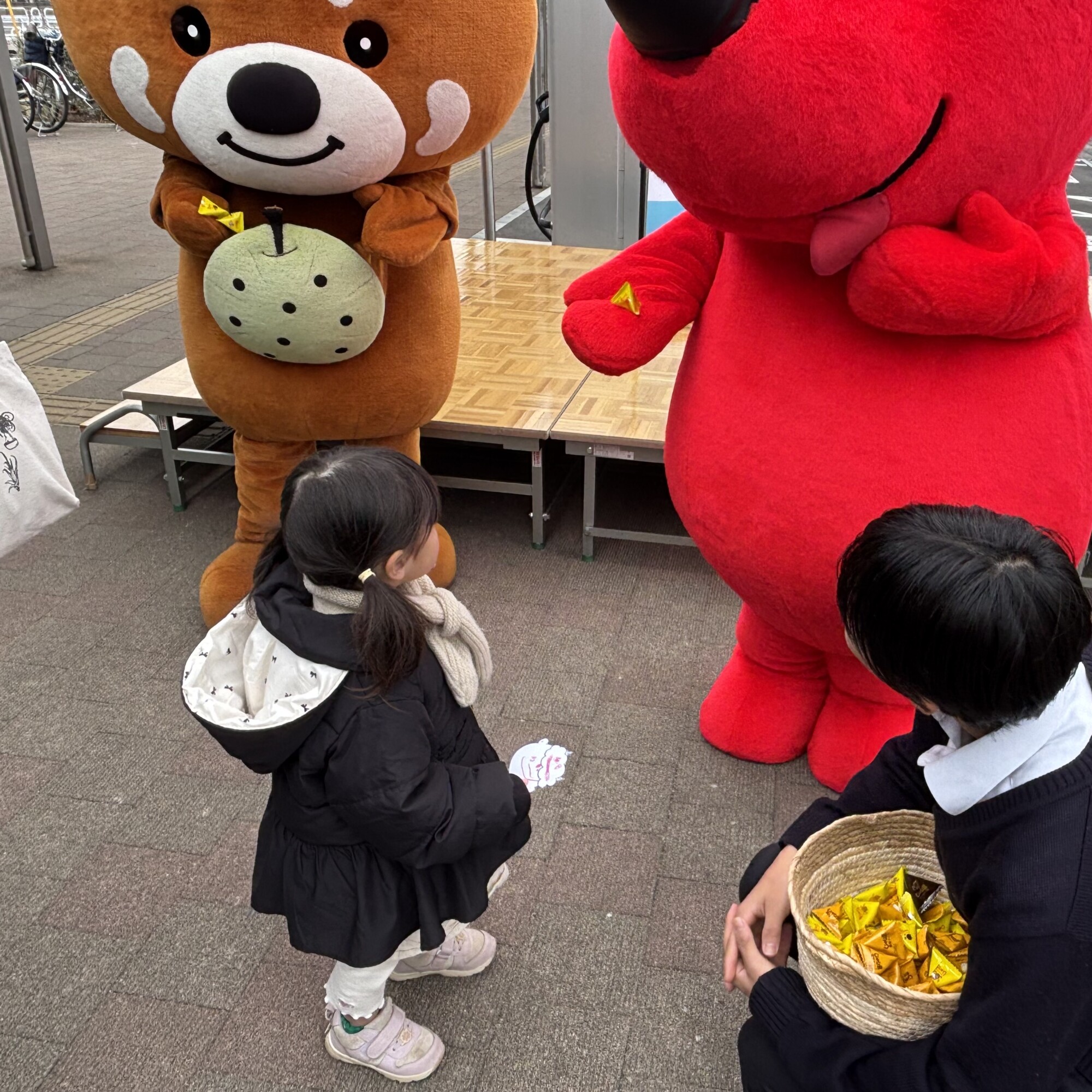 今回のイベントには、千葉商科大学付属高校の生徒たちもお手伝いとして参加。 チーバくんと梨丸くんに豆菓子を手渡す役を担当し、元気いっぱいにイベントを盛り上げてくれました。
