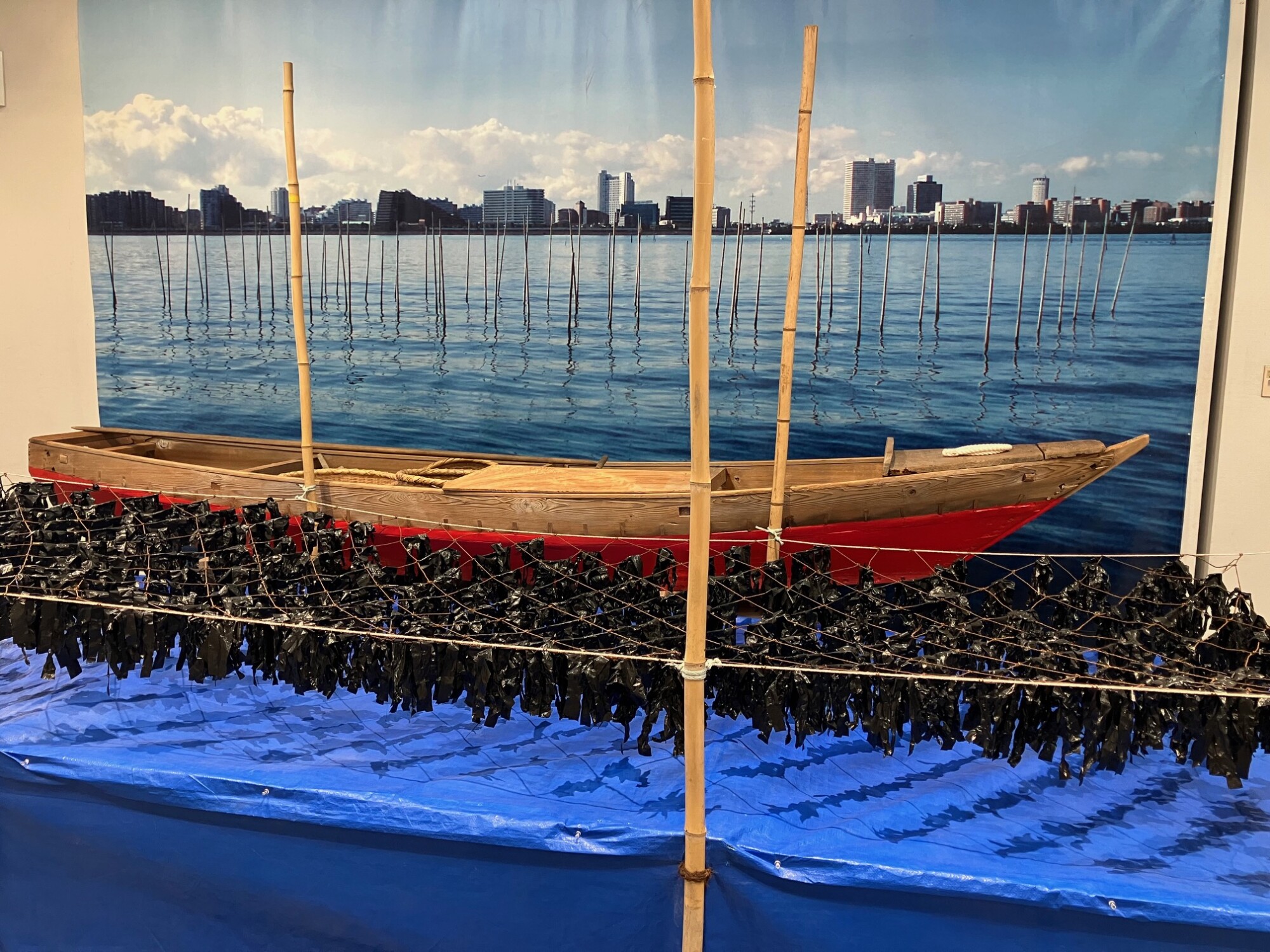 海苔すき台やたたき台、ヒコウキ包丁といった独特の道具、支柱に海苔網を張り、海苔の養殖場を再現した模型など、会場にはさまざまな収蔵品が展示されている。
