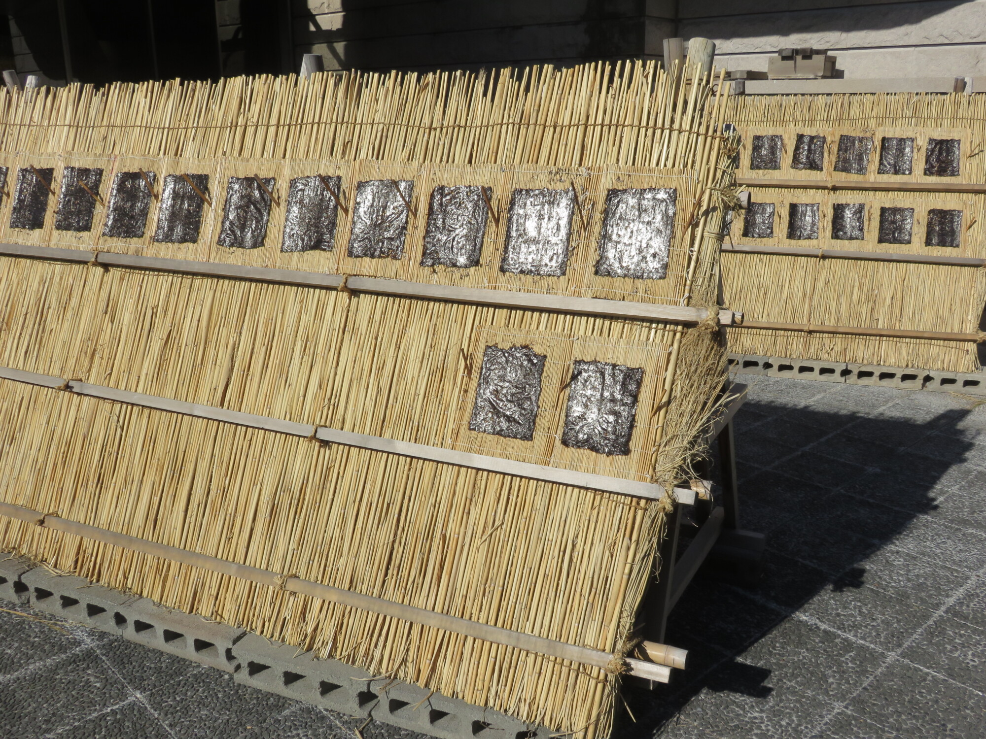 この季節、浦安市内の小学4年生が海苔すき体験で作った海苔が館内で枠干し、屋外展示場で天日干しされている。パリパリっと海苔が乾く音(「海苔が鳴く」という)がするので耳を澄ましてみよう。