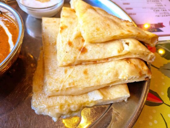 運ばれてきたチーズナンは食べやすくカットされ、中からとろ~りチーズ。スパイスのいい香りに食欲全開!