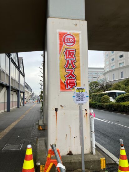 今、北口周辺では「新浦安駅北口バスベイ整備工事」が行われていて、その工事期間中の仮設停留所となるようです(北口のこれまでのバス停を『バスベイ型』と呼ばれる歩道部に切り込む形状に再整備)。