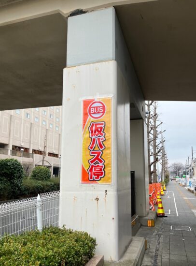 北口に行ってみると「BUS 仮バス停」の案内表示が目につきました。オレンジと黄色で目立ちます。ホテル側から駅につながる歩道橋の下です。