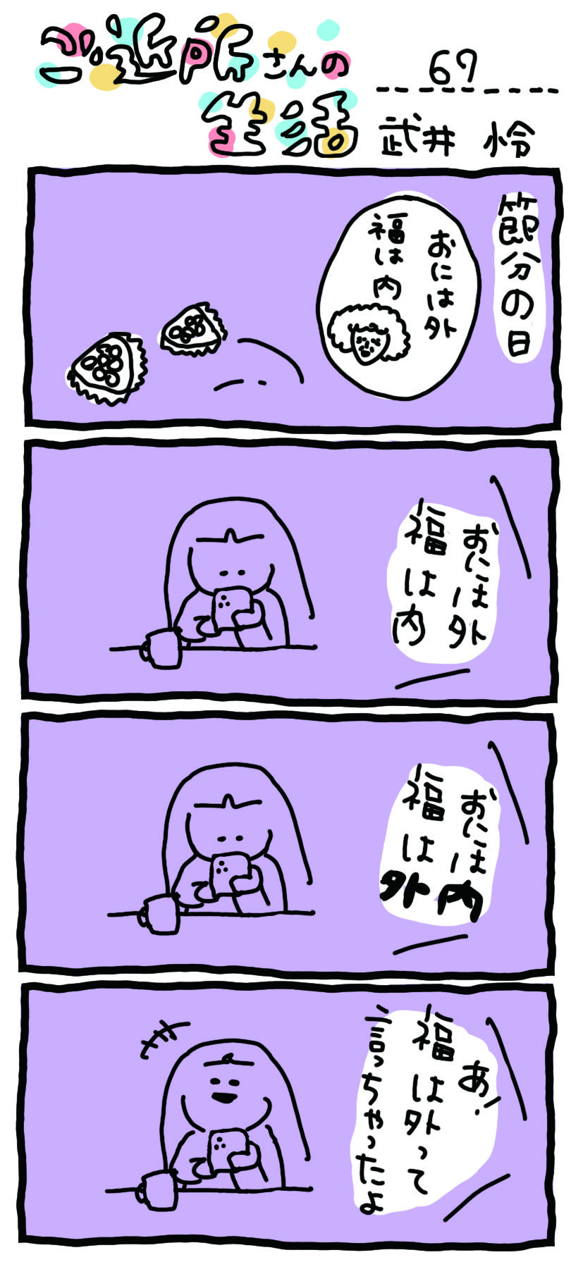 パパが、洗面所に、お豆をまいたときに、おには内、福は外、と、内と外を間違えて、逆のことを言ってしまいました。パパが、福は外って言っちゃった、と言う声が、洗面所から聞こえてきました。私は、そのとき、テレビのある部屋にいたのですが、笑いました。今のところ、おにがうちに来ているんだな、と思うようなことは、起きていないなと思います。