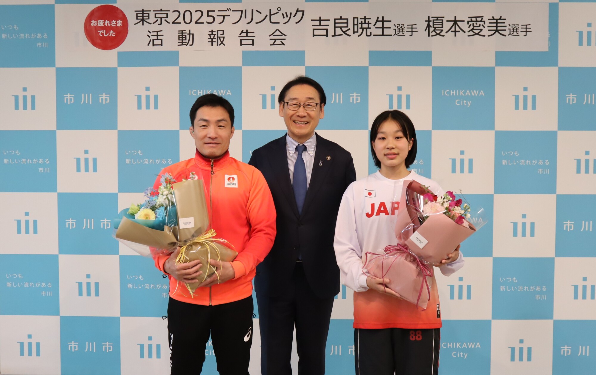 昨年11月に日本で初開催された聴覚障害者の国際スポーツ大会「東京2025デフリンピック」で、日本代表に選出された市川市在住の2人による活動報告会が、2月2日(月)、市川市役所第一庁舎1階で開かれ、田中甲市長をはじめ職員、市民らが健闘をたたえた。
