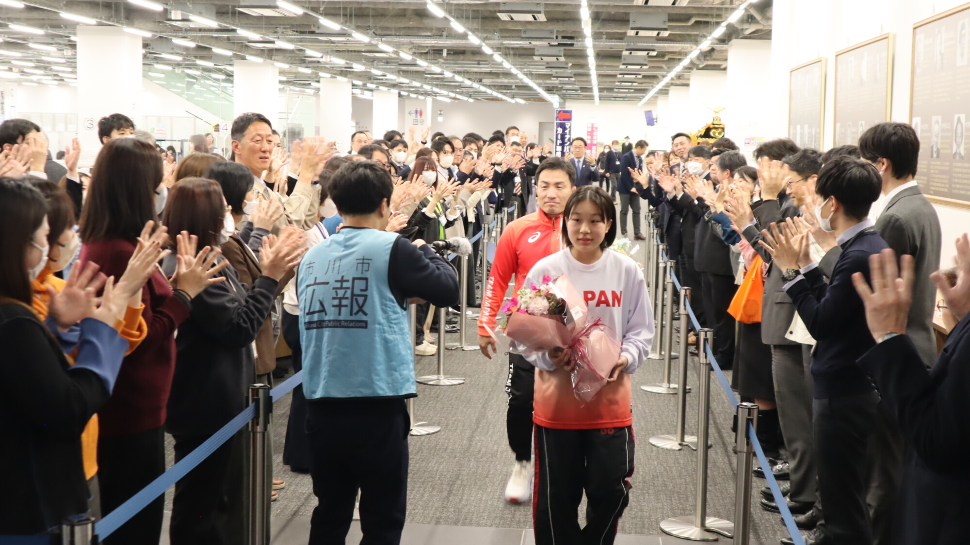 田中市長は「本当によく頑張られた。これからも活躍を応援しています」と述べ、2人に花束を手渡した。