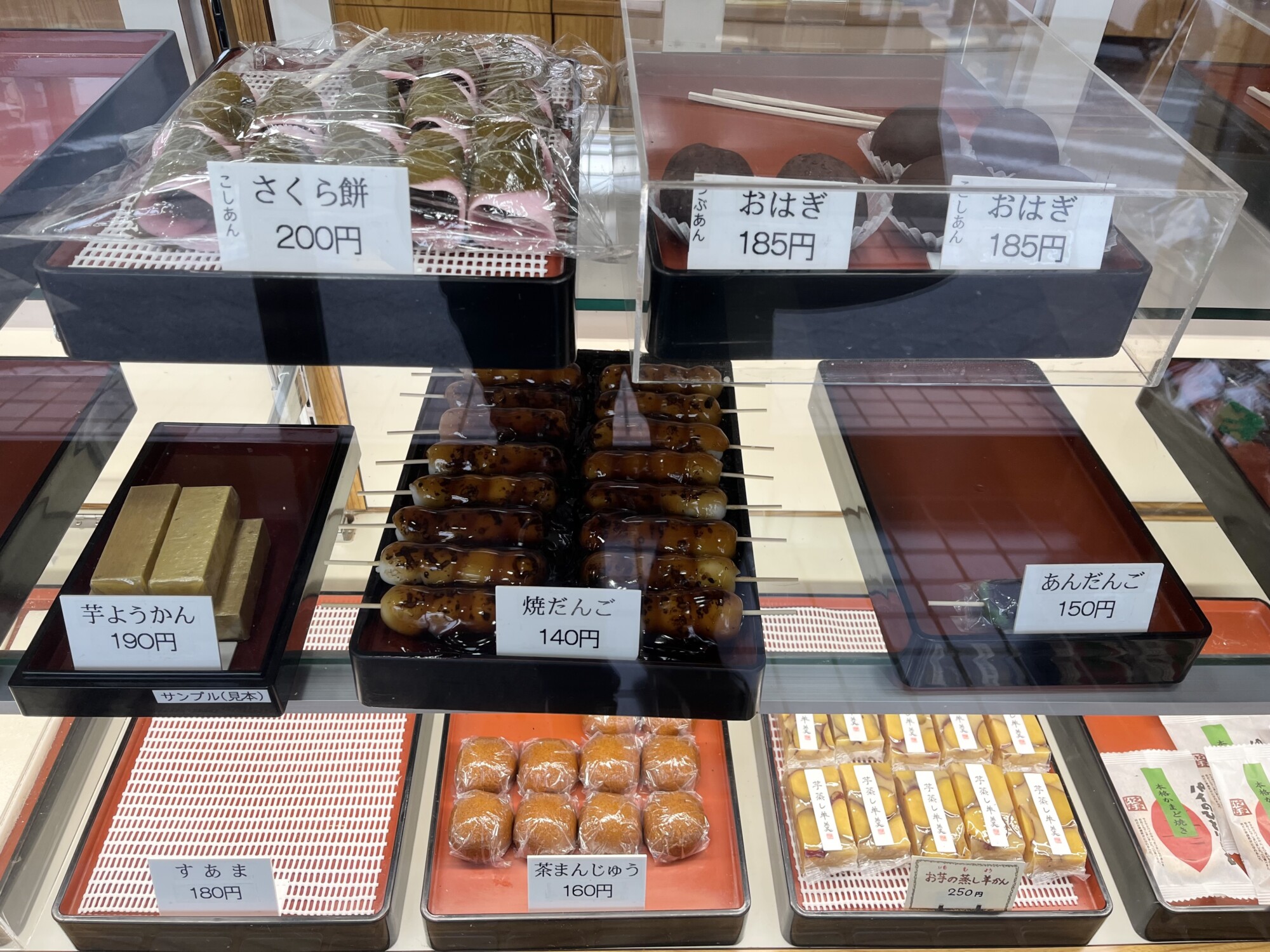 季節商品以外にも、通年販売している和菓子として、「お団子」や「おはぎ」、東京発祥の和菓子「すあま」などが並んでいました。