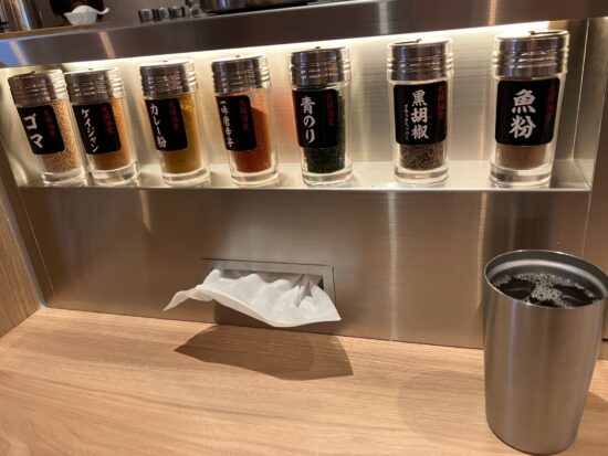 卓上にはさまざまなスパイスや調味料。自分好みにカスタマイズが可能なのでなんども足を運びたくなります。