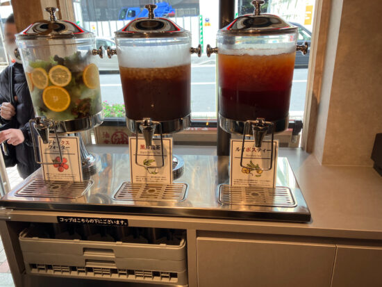 飲み物は無料で「ルイボスティー・ウーロン茶・デトックスウォーター・お水」から好きに選ぶことができます(セルフサービス)。コップもステンレスで冷たさが長続き!食べ終わる頃まで冷たさが続いていました。