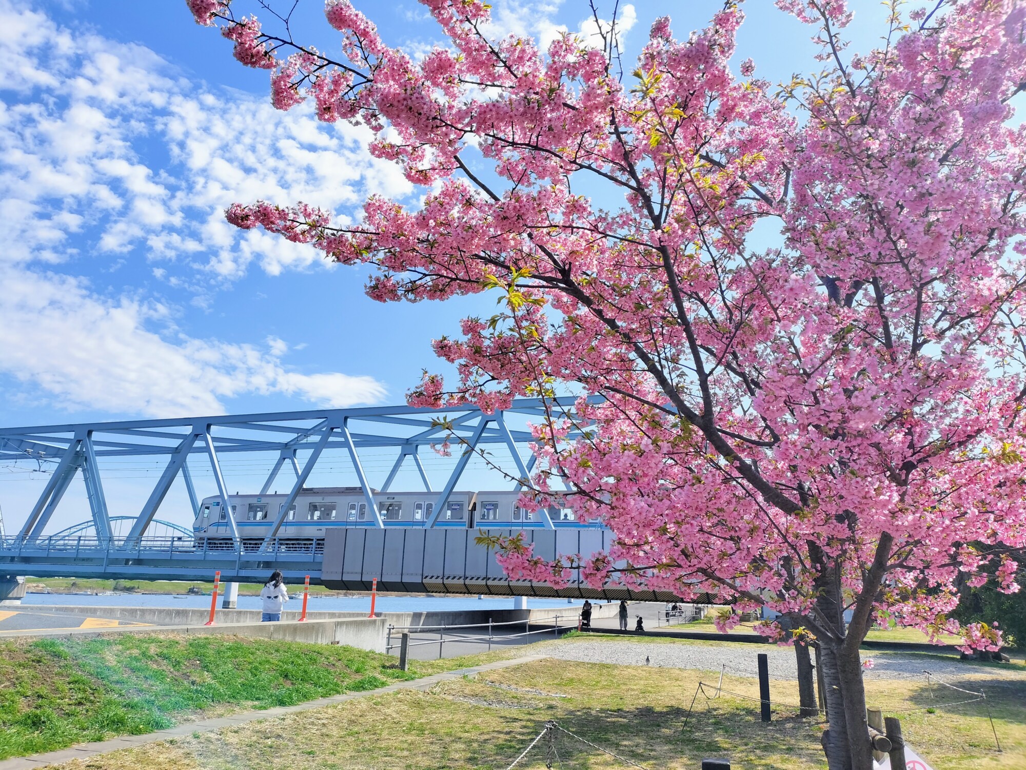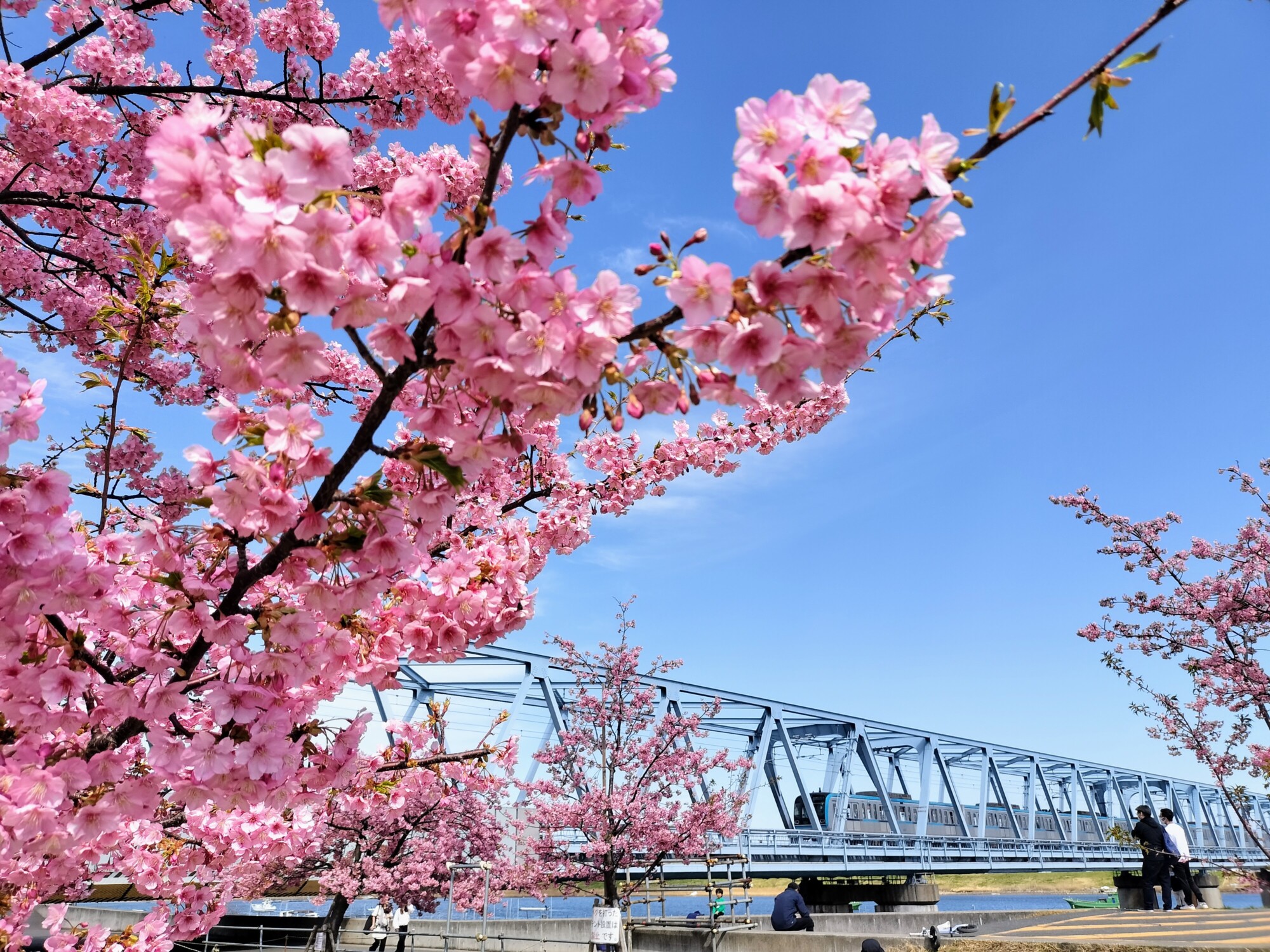 電車が横切るタイミングを狙って写真を撮る人の姿も見られました。鉄橋と青空のブルー、そして濃いピンク色の河津桜のコントラストは絶好の組み合わせ。電車好きでなくても、思わずカメラを向けたくなります。