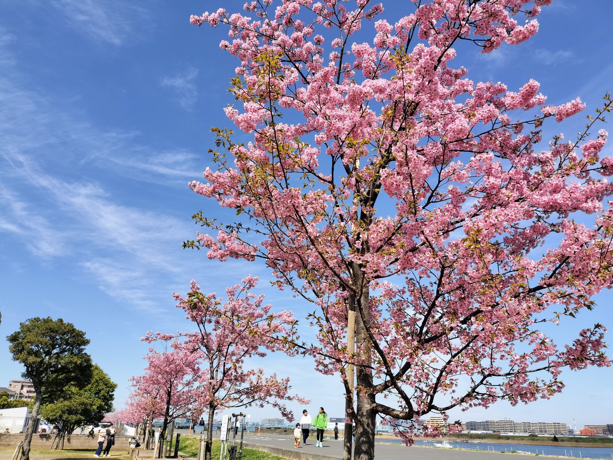 江戸川放水路の河川敷、妙典小学校前の江戸川堤防上では、いま約50本の河津桜が見頃を迎えています 。