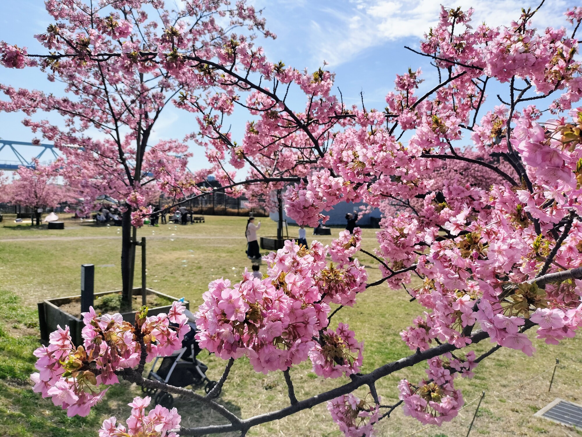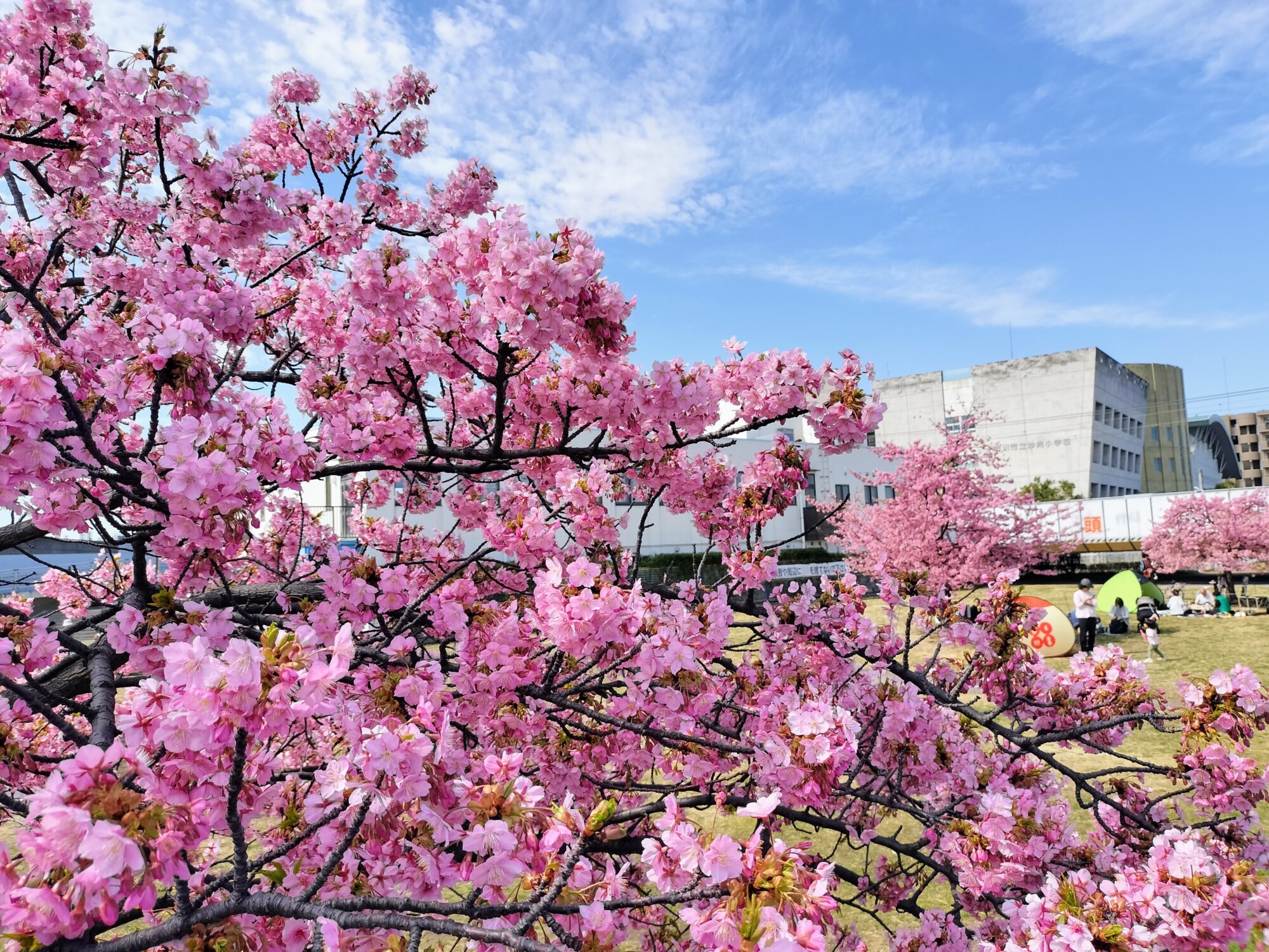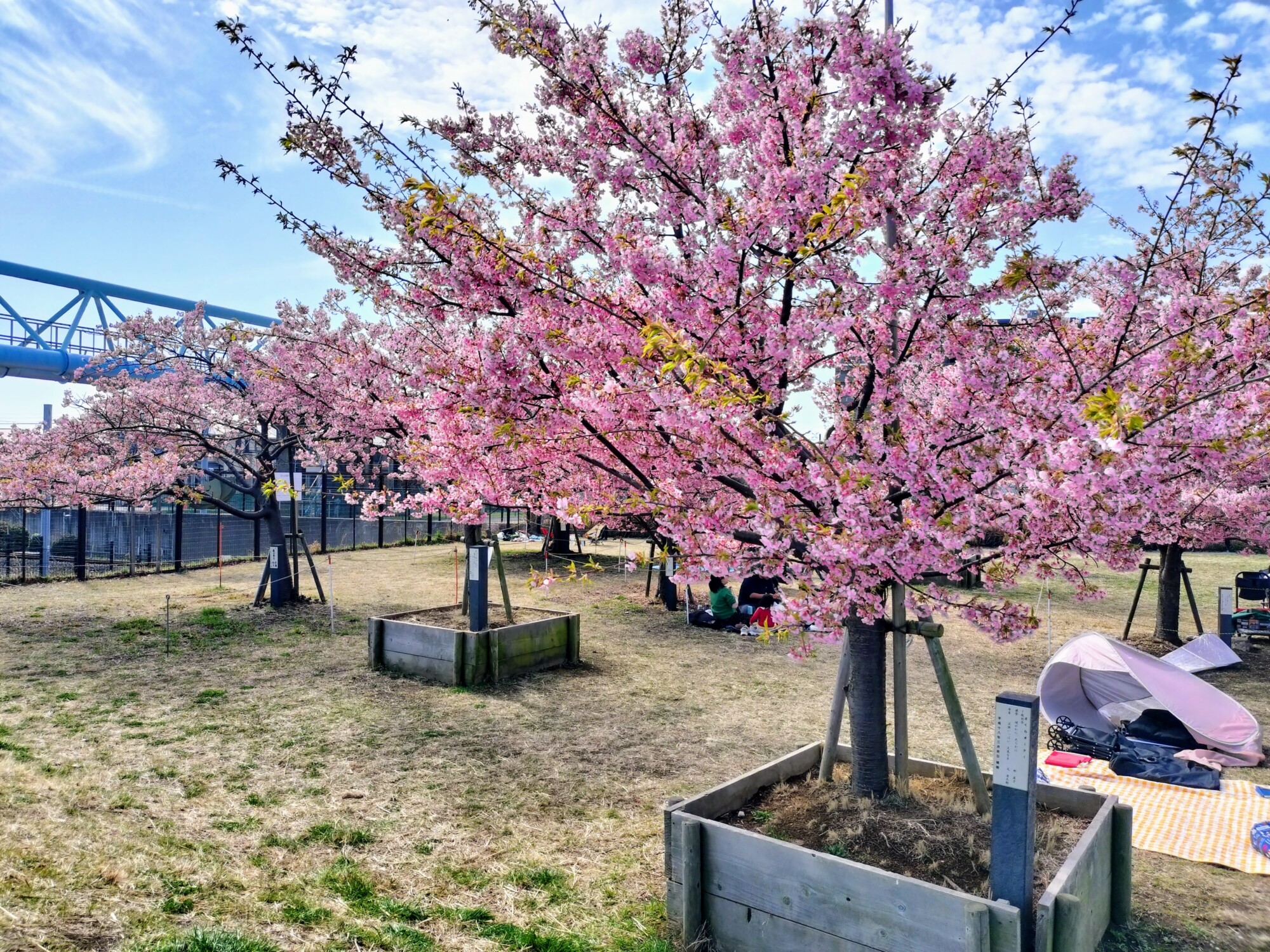 芝生が広がる南側のエリアでは、河津桜が点在するように植えられています。取材日の2月28日は気持ちよく晴れ、お花見日和。色とりどりのポップアップテントが並び、お弁当を広げて花見を楽しむ人たちでにぎわっていました。