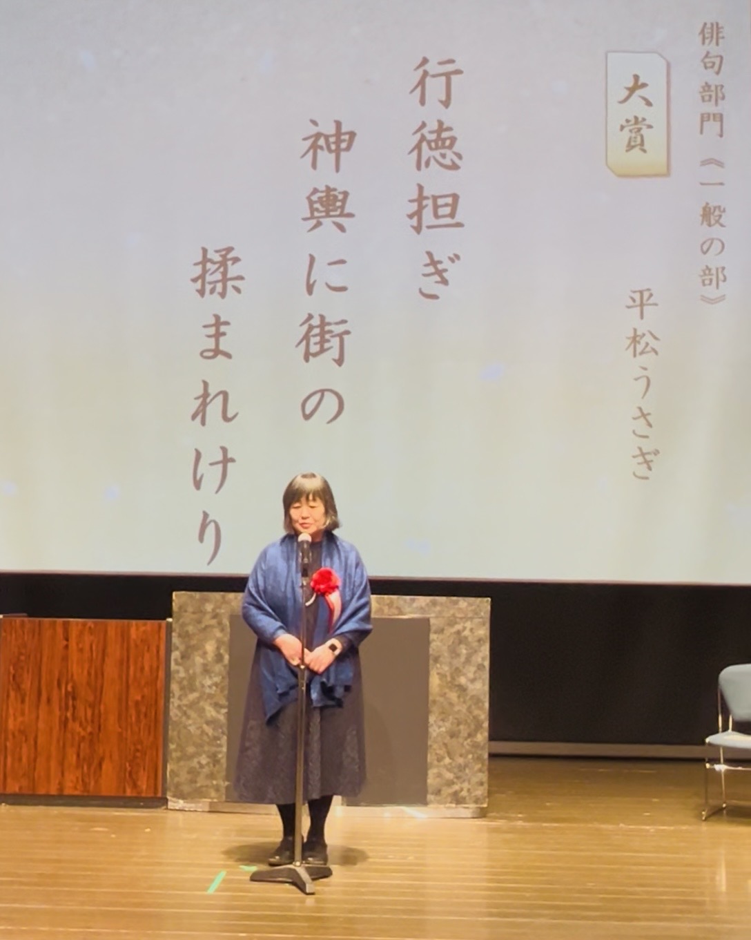 一般の部のテーマは「二〇二五年市川を詠む」。俳句大賞には、東京都練馬区在住の平松うさぎさんの『行徳担ぎ神輿に街の揉まれけり』が選ばれた。行徳ふれあい伝承館で見た神輿の実物や映像に強い印象を受けて詠んだといい、「機会をつくって実際に行徳の祭りを見てみたい」と話した。